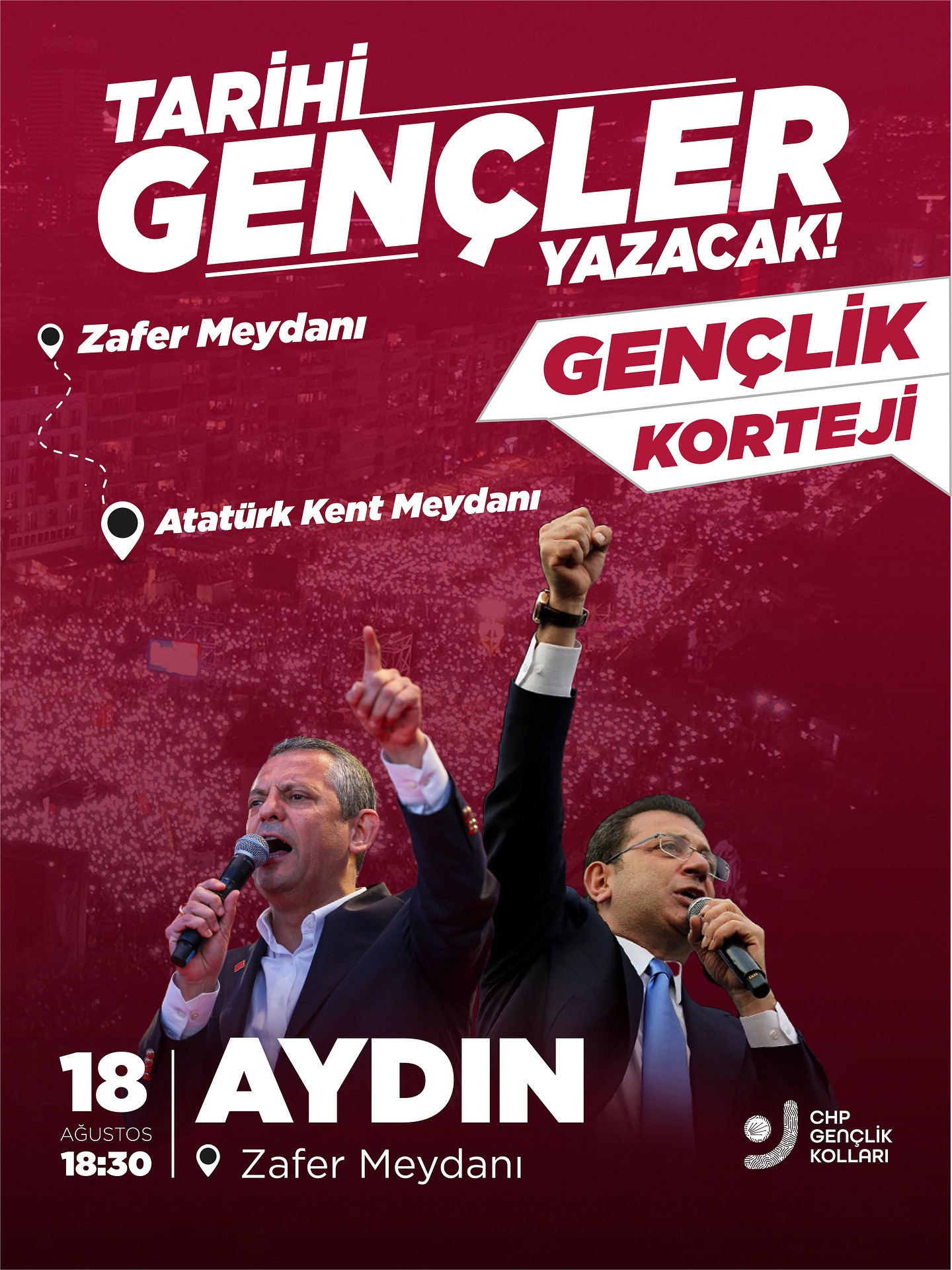 CHP Genel Başkanı Özgür Özel, “Millet iradesine sahip çıkıyor” mitingi kapsamında 18 Ağustos’ta Aydın Atatürk Kent Meydanı’nda vatandaşlarla buluşacak. Özel’in aynı gün saat 18.30’da CHP Aydın İl Gençlik Kolları tarafından düzenlenecek “Tarihi Gençler Yazacak” kortejine de katılacağı öğrenildi.
