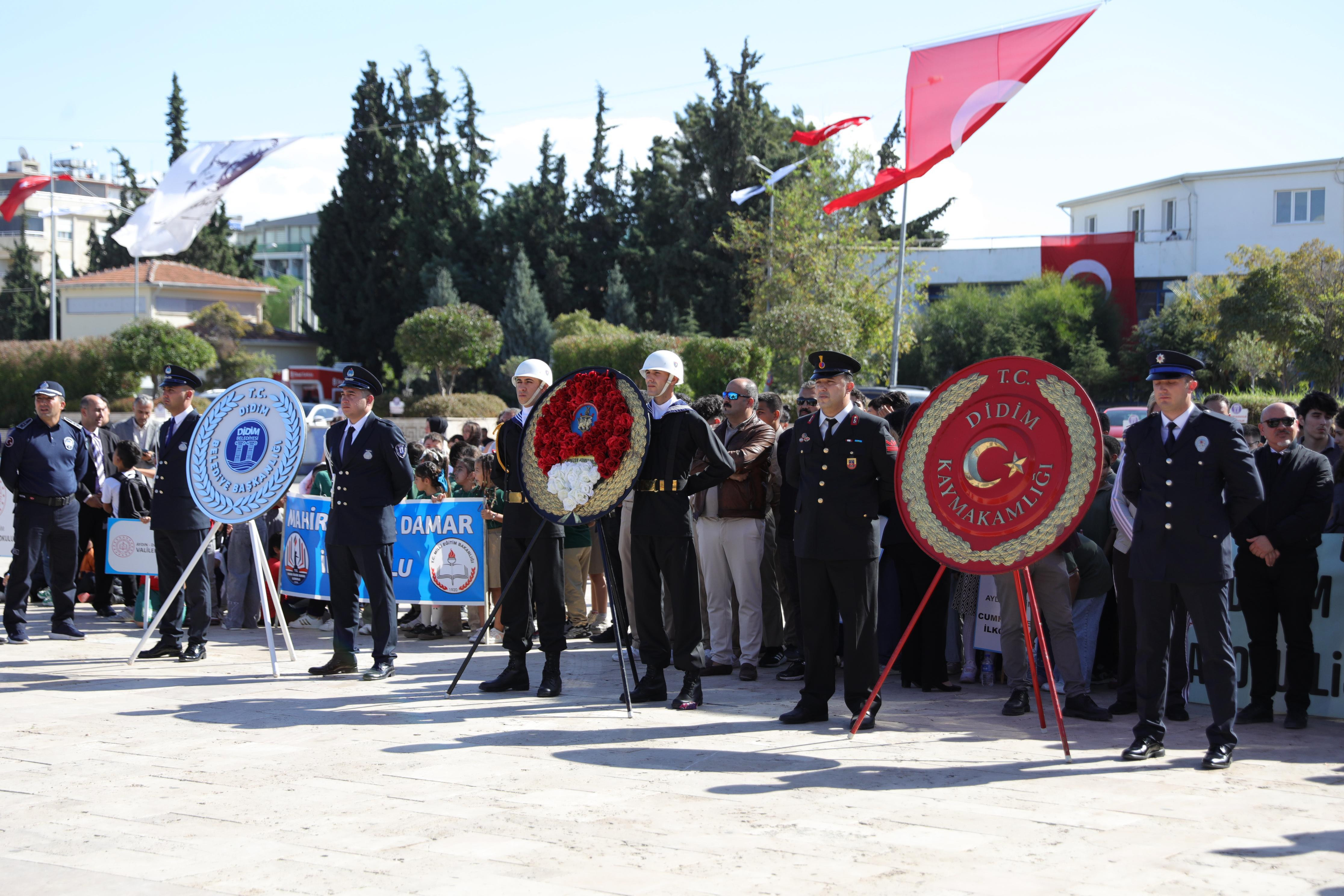 Didim’de 29 Ekim Cumhuriyet Bayramı, büyük bir coşkuyla kutlandı. Cumhuriyet Kent Meydanı’nda gerçekleştirilen törene Didim Kaymakamı Mesut Çoban, Didim Garnizon Komutanı Albay Erkut Arslan, Didim Belediye Başkanı Hatice Gençay, Didim Cumhuriyet Başsavcısı Anıl Altay, Didim Emniyet Müdürü Yunus Dinç ile birlikte ilçe protokolü, kamu kurum amirleri, siyasi parti temsilcileri, askeri erkan, öğrenciler ve çok sayıda vatandaş katıldı.