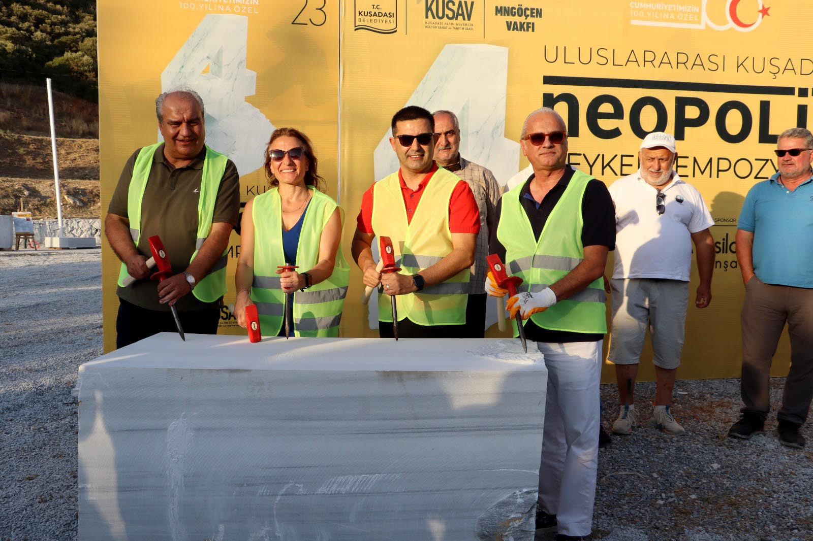 4. Uluslararası Kuşadası Neopolis Heykel Sempozyumu, konuşmaların ardından Başkan Ömer Günel, Mehmet Nuri Göçen Kültür, Sanat ve Eğitim Vakfı’nı temsilen Ebru Gökçe, ARYA Turistik Tesisleri Yönetim Kurulu Başkanı Tümer Apaydın ve KUSAV Başkanı Levent Köylü tarafından vurulan ilk sembolik çekiç darbesi ile başladı.