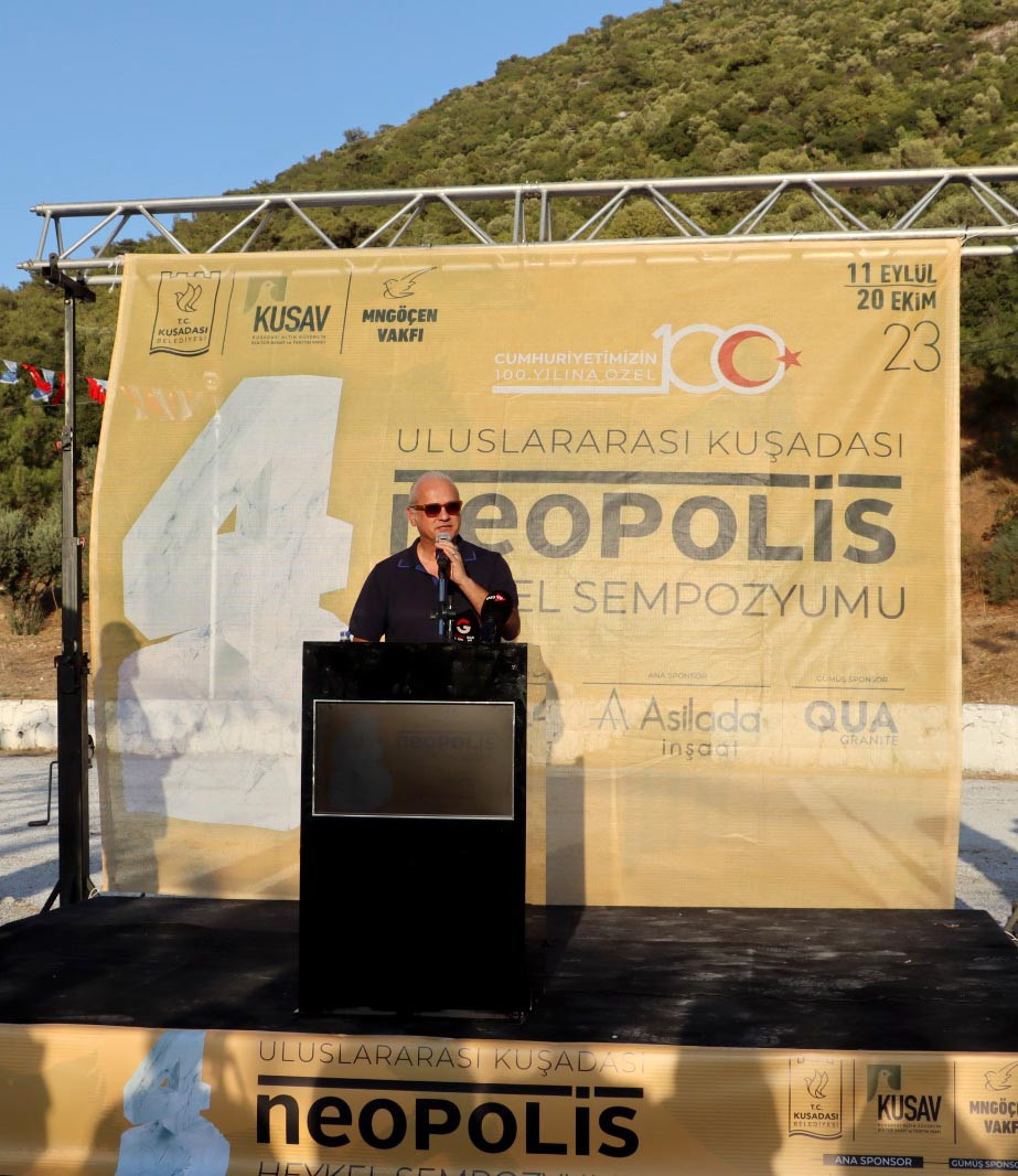 KUSAV Başkanı Levent Köylü ise sanat için yeniden bir arada olmaktan gurur ve mutluluk duyduklarını ifade ederek “Hepimizin bildiği gibi kentler insanların yaşadığı, çalıştığı, sosyal ilişkiler kurduğu ve hayatlarını sürdürdüğü mekanlardır. Kentler bir kültürün, bir tarihin ve bir kimliğin yansıtıldığı yerlerdir. Heykel sanatı bu kültürü şekillendiren, yansıtan en önemli unsurlardan bir tanesi. Heykel sanatı kentlerimize karakter katar. Büyük anıtlar, tarihi figürlerin heykelleri veya çağdaş sanat eserleri bir şehrin ruhunu ve değerini yansıtır. Bu sanat eserleri aynı zamanda kentlerin hafızalarıdır. Geçmişle bağlantı kurarak kültürel mirasımızı yansıtmamıza yardımcı olur. Neopolis Heykel Sempozyumu Kuşadası’nın daha sanatsal bir kent haline gelmesini nasıl sağlayacağımızı düşünmeye ve fikirlerimizi paylaşmaya vesile oluyor. Dört sene önce Belediye Başkanımız Sayın Ömer Günel’in bir sanat ve müzik kenti yaratmak için yola çıktığı Kuşadası’nda bunun en önemli ayaklarından birini Neopolis Heykel Sempozyumu oluşturuyor” dedi.