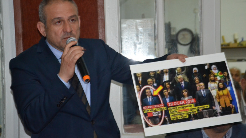 AK Partili Abak, vatandaşlara CHP Genel Başkan Yardımcısı ve Aydın Milletvekili Adayı Bülent Tezcan’ın 28 Ocak 2016 yılında katıldığı HDP’nin kongresinde terör örgütü PKK’nın gerilla marşında saygı duruşunda durduğu fotoğrafları gösterdi. Abak, “Her fırsatta terör örgütüyle iş tutmayız diyen CHP’yi görüyorsunuz. İşte aralarına koydukları mesafe bu. Sayın Tezcan, PKK’nın gerilla marşında esas duruşta duruyor. Her tarafta da PKK’nın paçavra bayrağı. Utanmadan bir de oy istiyorlar” ifadelerini kullandı.