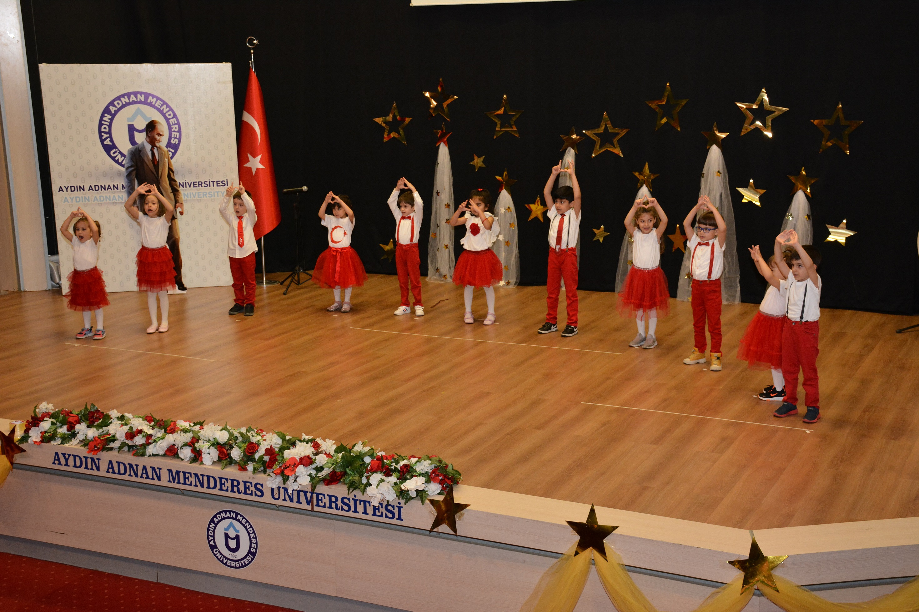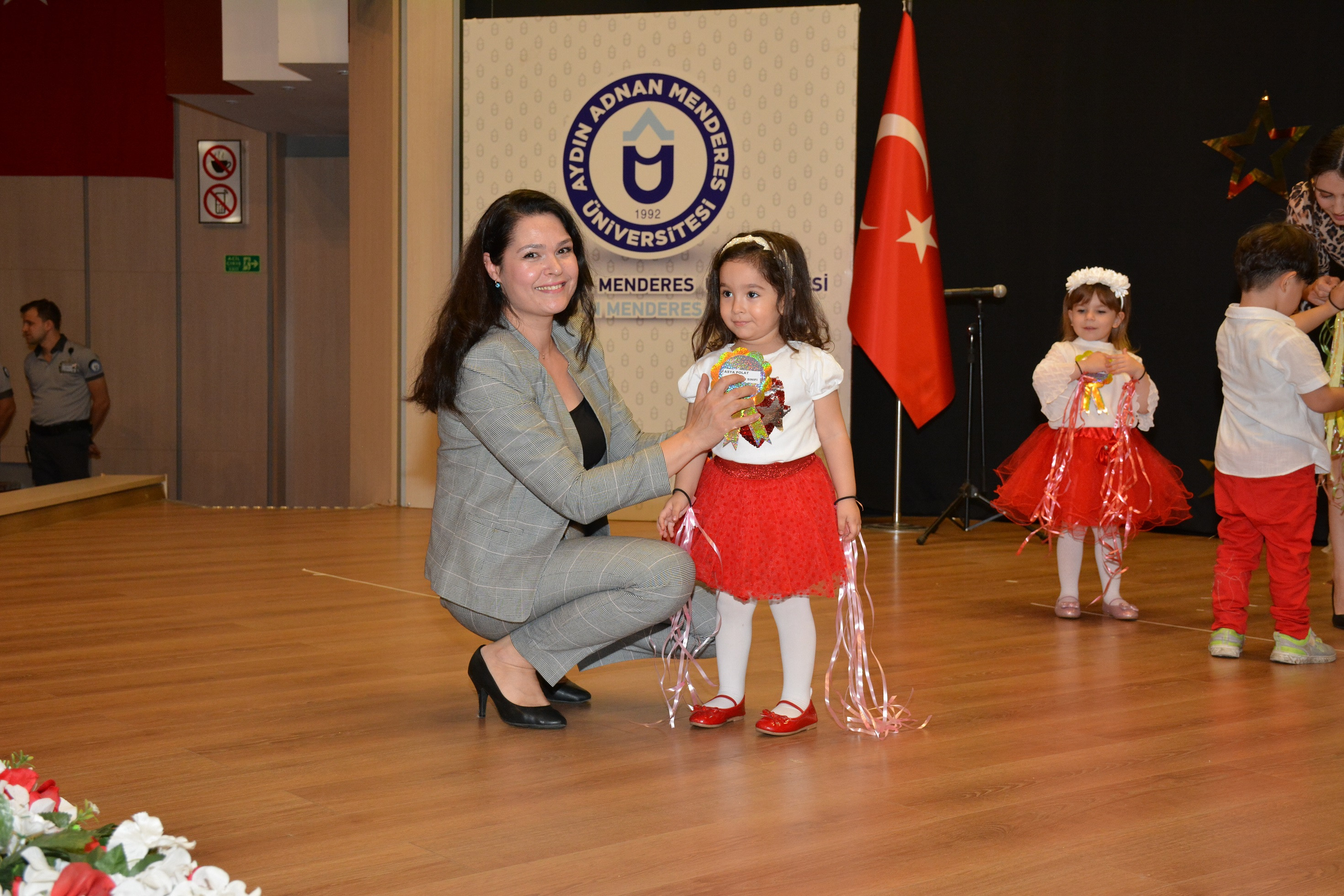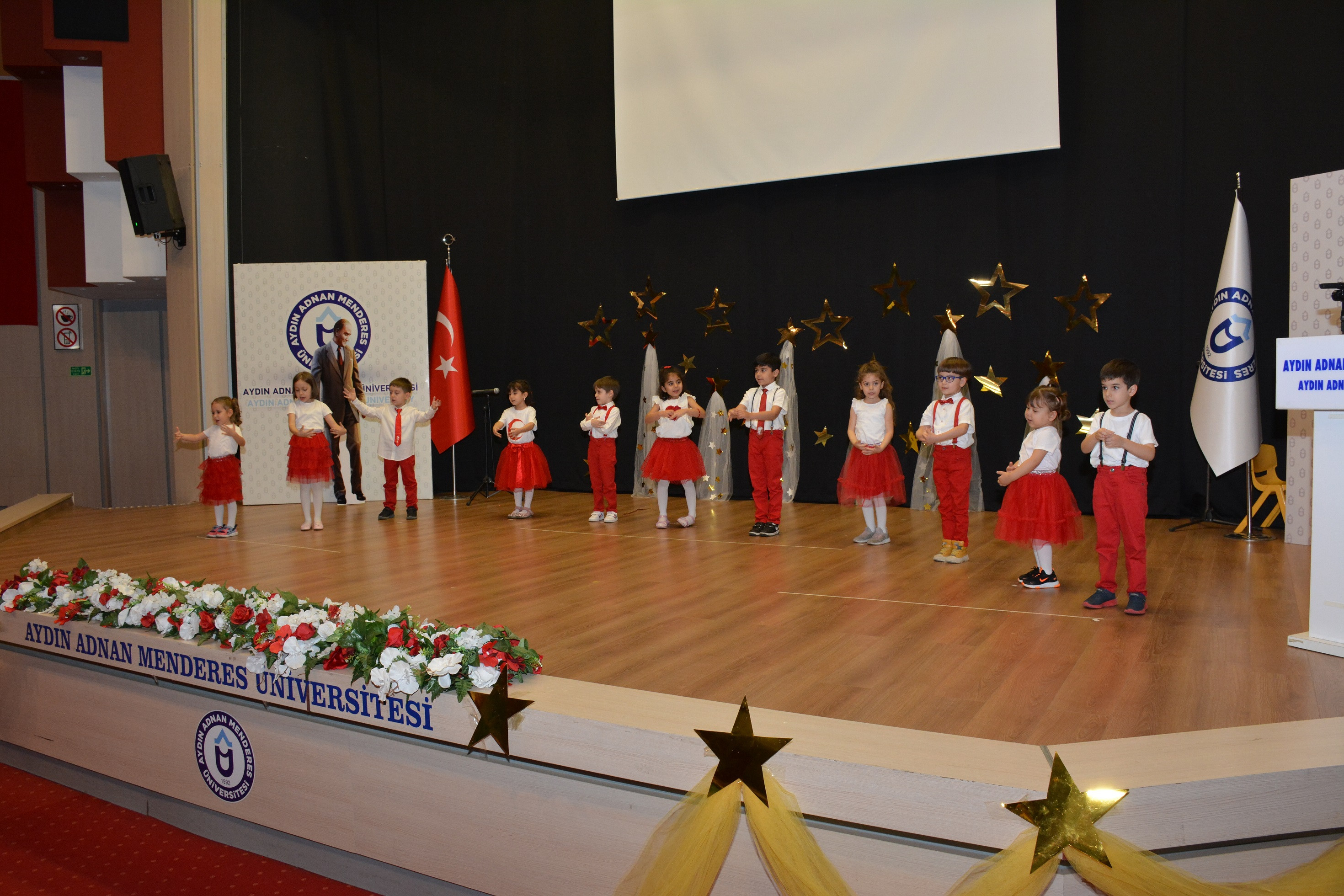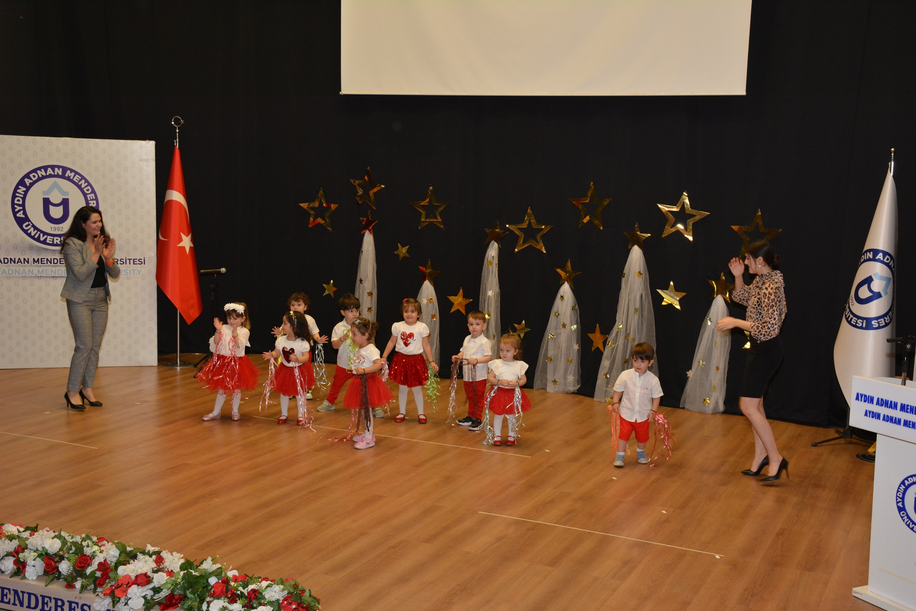 Saygı Duruşu ve İstiklal Marşı ile başlayan programda, günün anlam ve önemini belirten konuşmayı Üniversitemiz Anaokulu Müdürü-Eğitim Koordinatörü Öğr. Gör. Sibel Güldalı Dereli yaptı. Öğr. Gör. Dereli konuşmasında, “Bu yıl eylül ayında küçük bir aile olarak başladığımız bu yolculuğu öğrenci katılımının artmasıyla büyük bir aile olarak tamamlamış olmanın haklı gururunu yaşıyoruz. Sevgili anne ve babalar, çocuğunuzu bizlere büyük heyecanla emanet ettiniz, çocuklarımızın yüreklerinde de aynı sevinç ve heyecan vardı. Bizler ADÜ Anaokulu olarak emanet ettiğiniz değerli varlıklara gücümüz yettiğince önce sevgi ve ilgimizi daha sonra bilgimizi sunduk. Mezun olan öğrencilerimiz için ayrılık vaktidir. Eğitim yılı içerisinde yardım ve desteklerini esirgemeyen ve çocukların eğitimine katkıda bulunan tüm anne ve babalara teşekkür ederim.” dedi.
