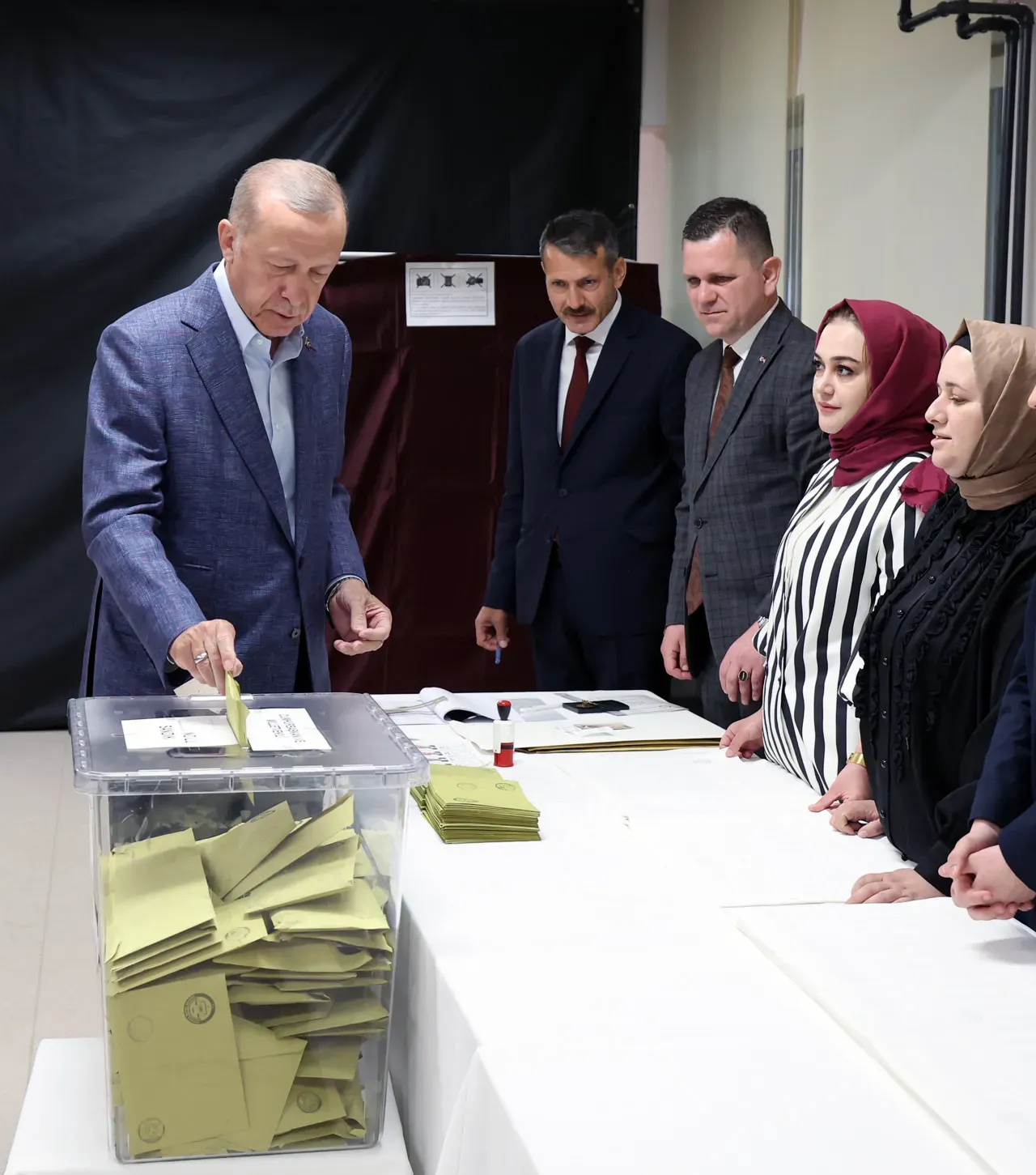 AKP'li Cumhurbaşkanı Recep Tayyip Erdoğan ve eşi Emine Erdoğan, Cumhurbaşkanı ve 28. Dönem Milletvekili Seçimlerinde oylarını kullanmak için Üsküdar Kısıklı’daki konutlarından saat 13.50’de Saffet Çebi Ortaokulu’na geldi.