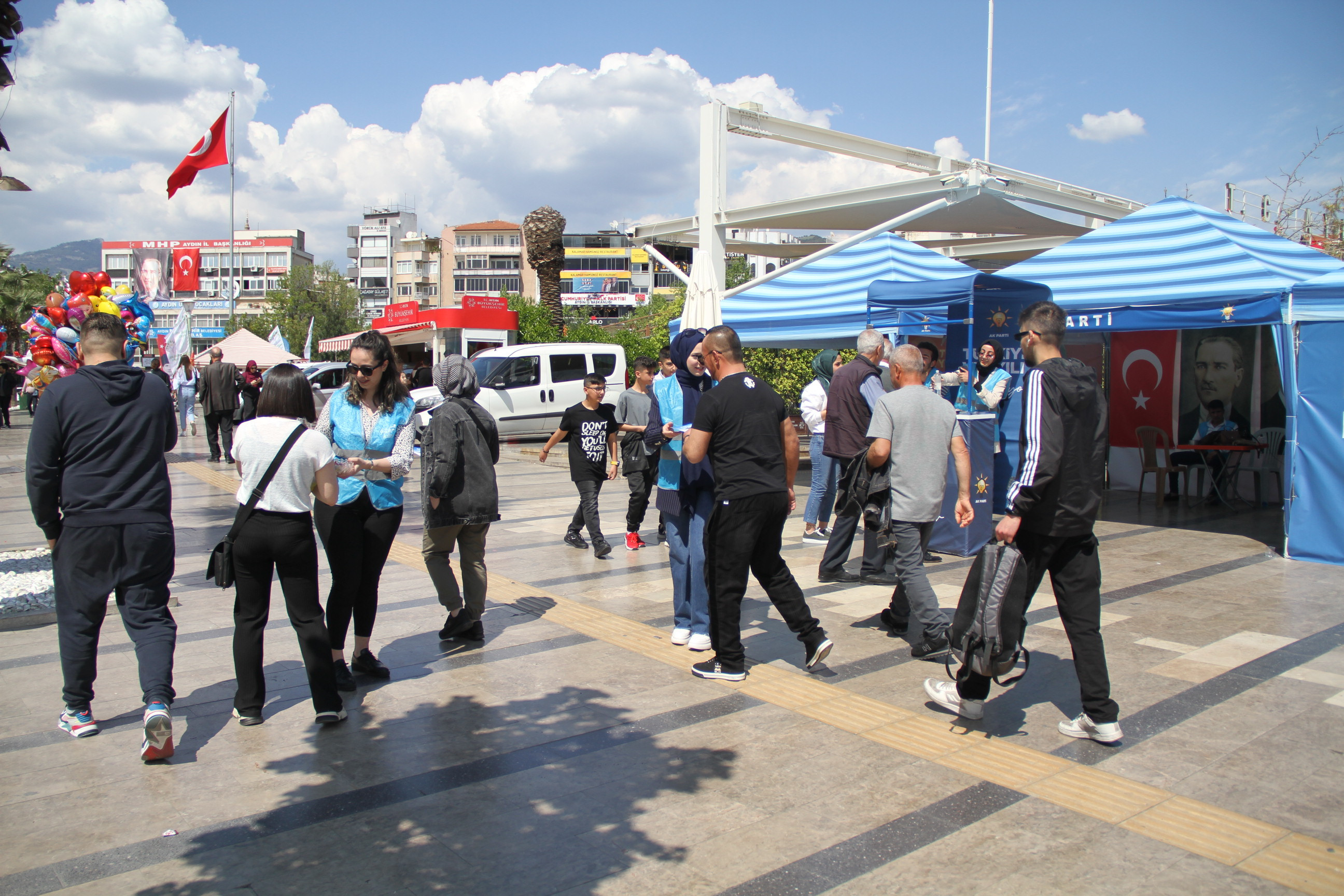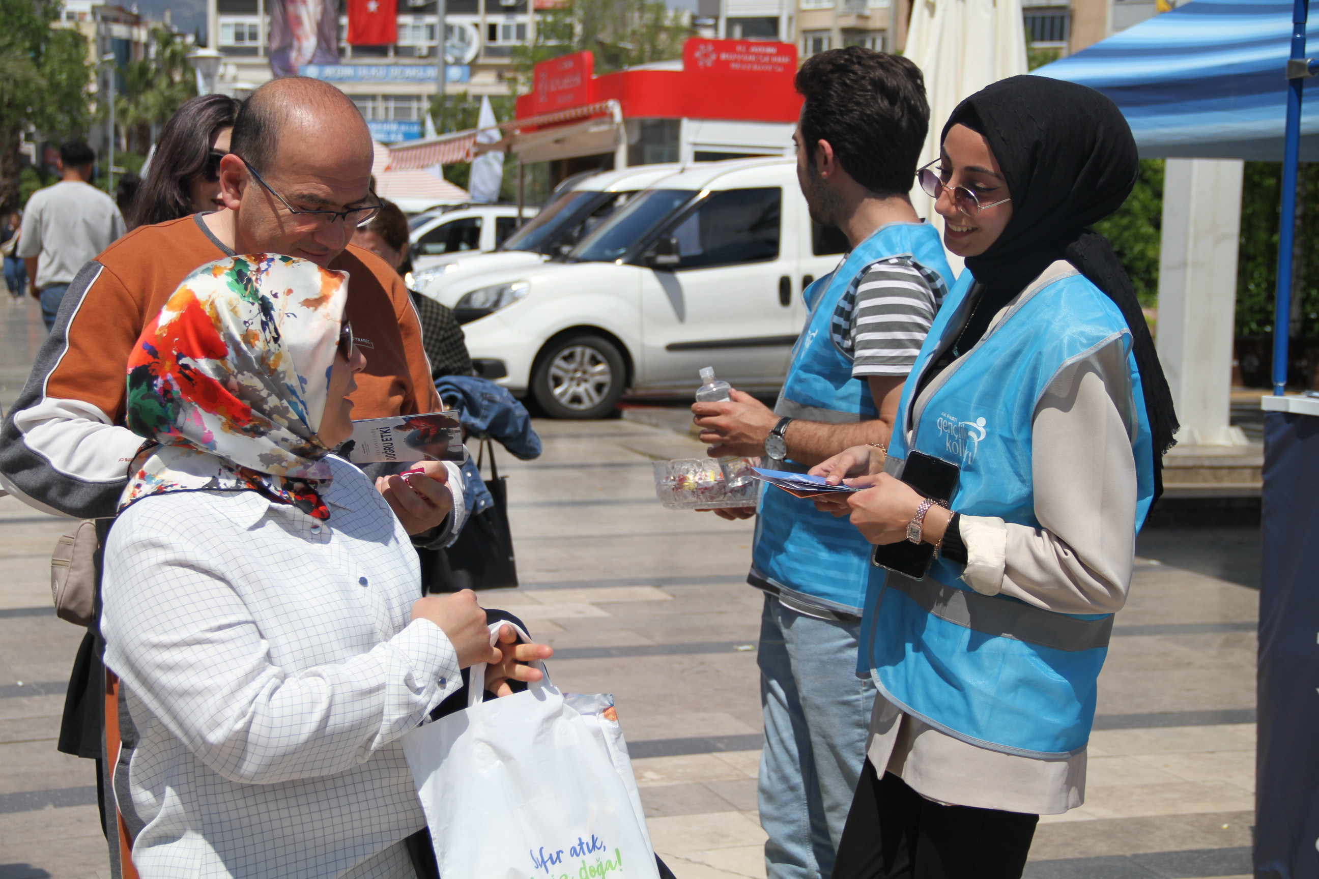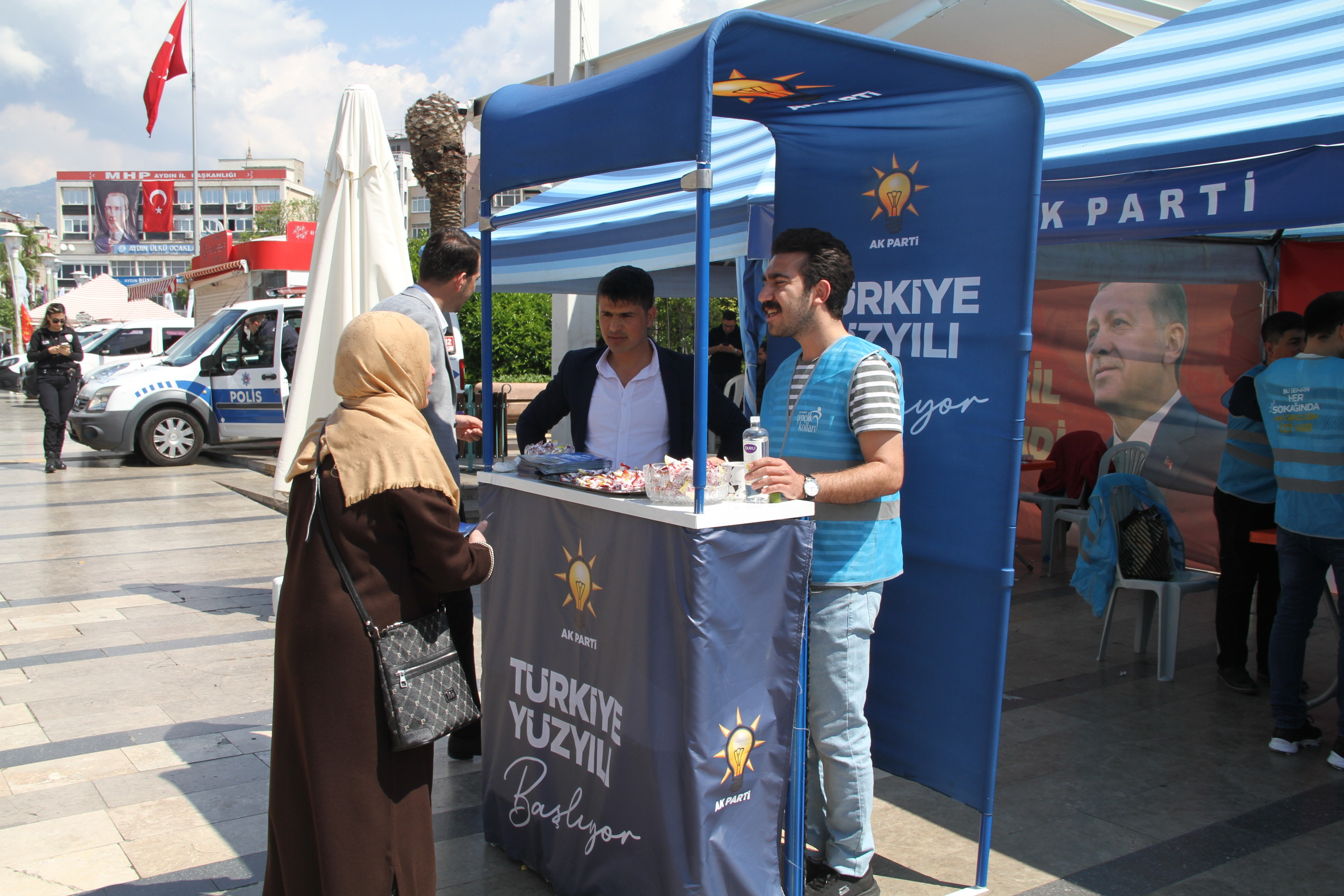 AK Parti Aydın İl Gençlik Kolları Kent Meydanı'nda stant çalışmalarında vatandaşın gönlüne giriyor.