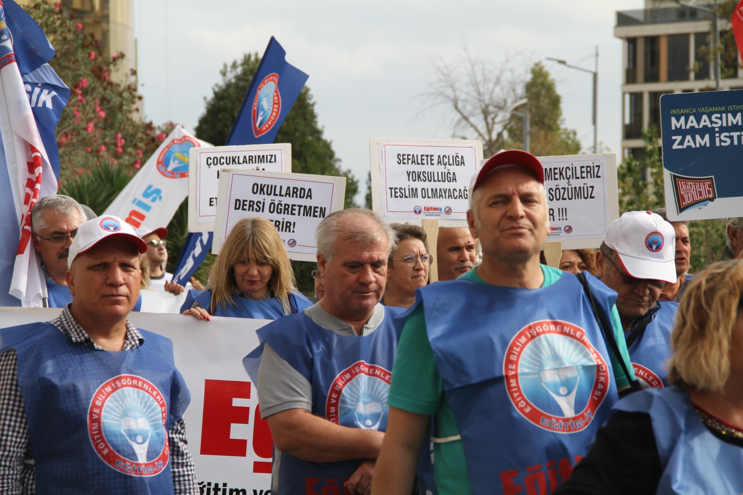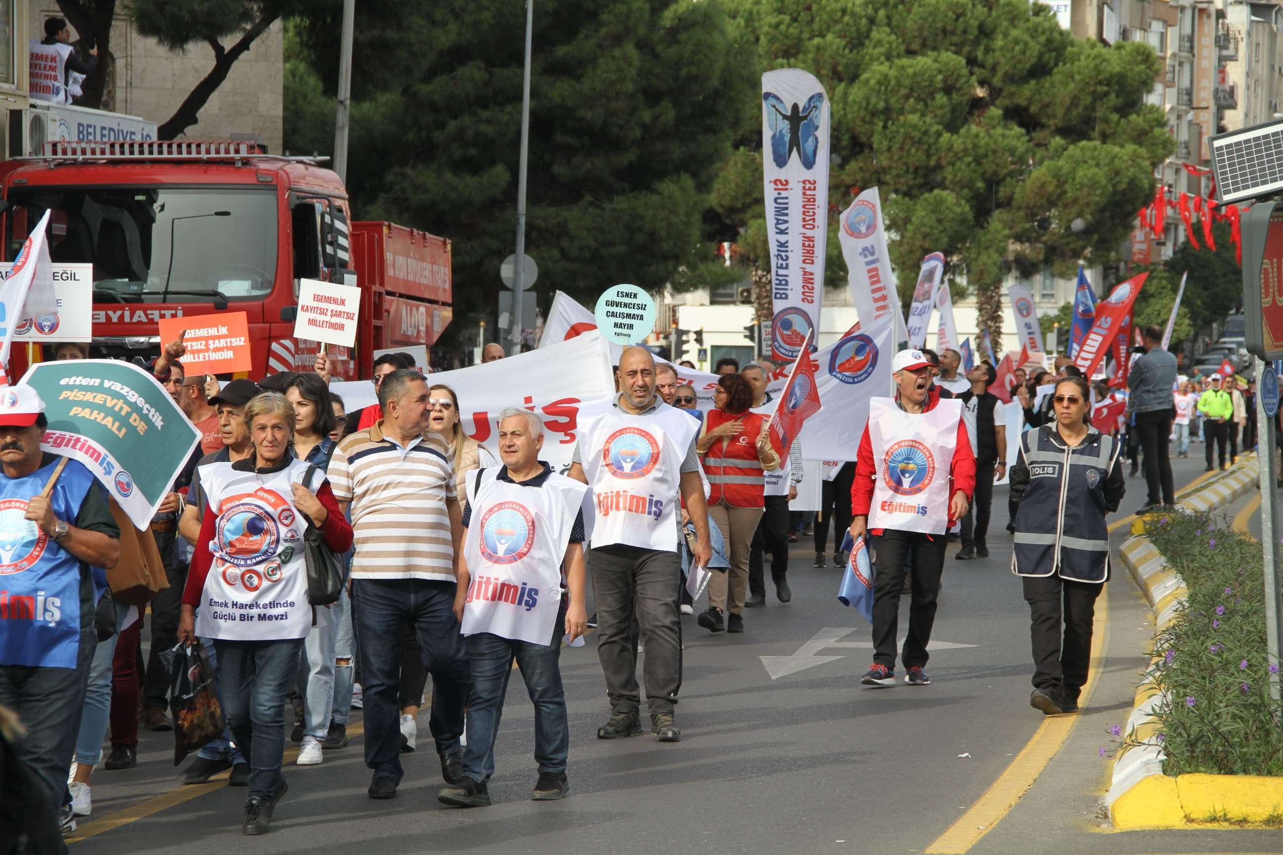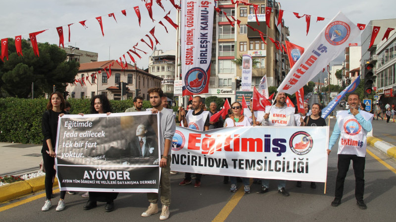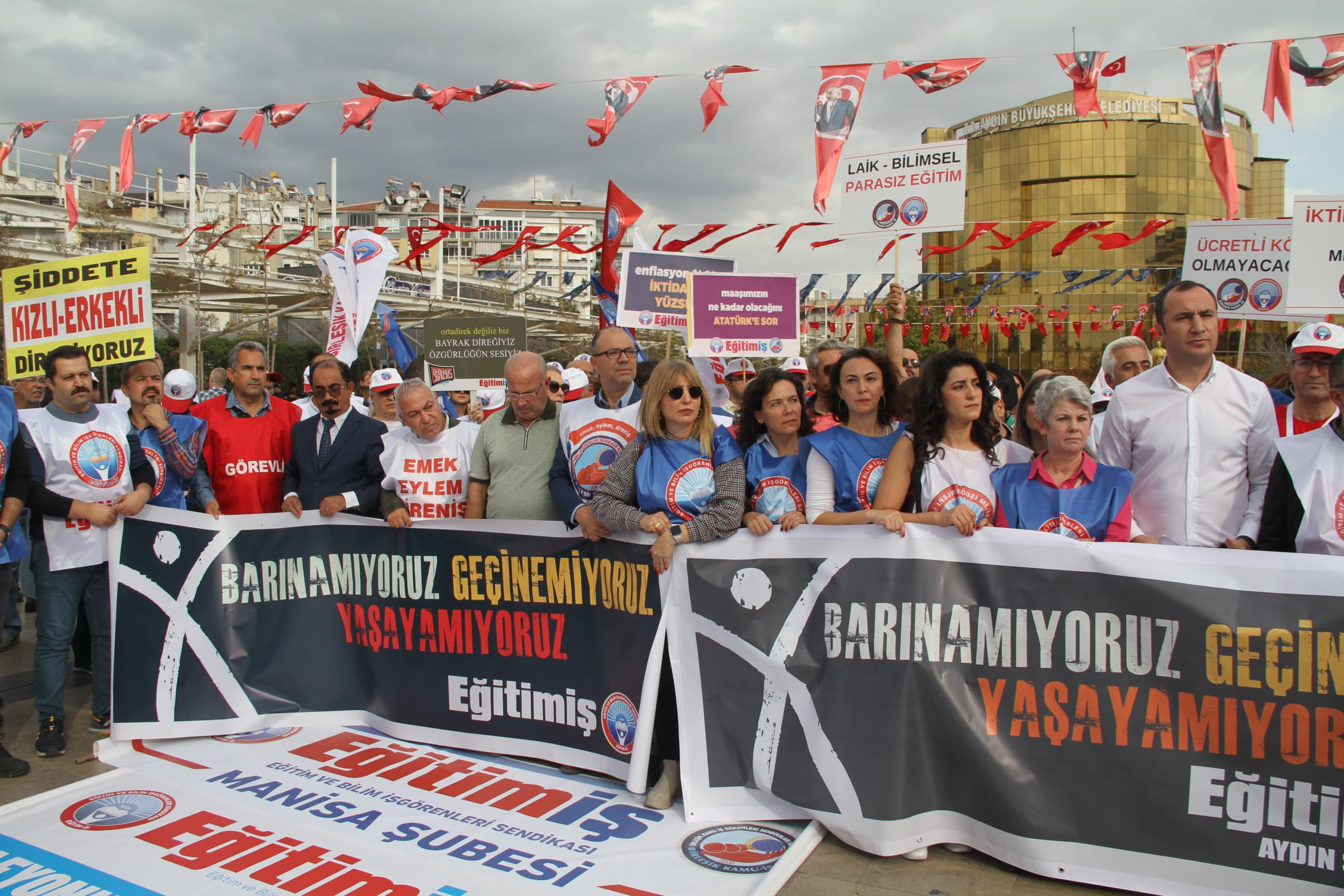 Aydın Efeler Diyarı'nda toplanan Eğitim-İş üyeleri, Atatürk Kent Meydanı'nda seslerini duyurdu. Genel Başkan ve MYK üyeleri, Afyon, Balıkesir, Burdur, Denizli, İzmir, Manisa, Muğla, Uşak'tan gelen mücadele arkadaşlarıyla bir araya geldi.