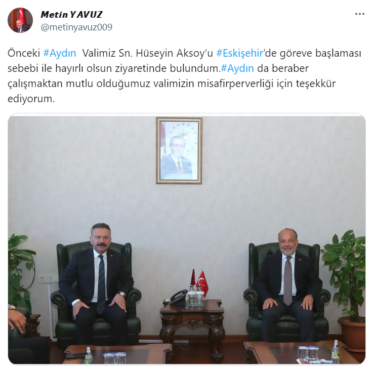 AK Parti'nin güçlü ismi Metin Yavuz, Twitter'da yaptığı paylaşımda şu sözlere yer verdi: "Önceki Aydın Valimiz Sn. Hüseyin Aksoy’u Eskişehir’de göreve başlaması sebebi ile hayırlı olsun ziyaretinde bulundum." Bu samimi ziyaretin ardından yapılan açıklamada, Aydın Valisi Hüseyin Aksoy'un Eskişehir Valiliği görevine başlaması dolayısıyla gerçekleştirilen bu dostça buluşmanın önemi vurgulandı.