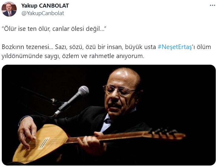 Bugün, Neşet Ertaş'ı ölüm yıldönümünde saygı, özlem ve rahmetle anıyoruz. Onun müziği, yaşadığı her anı aydınlatmış, içimizi ısıtmış ve ruhumuza dokunmuştur. Vali olarak, Aydın'ın ve ülkemizin bu büyük sanatçısına olan minnetimizi ifade etmekten gurur duyuyorum. Neşet Ertaş'ın mirası yaşatılmalı, yeni kuşaklara aktarılmalıdır, çünkü onun eserleri ve sanatı ölümsüzdür.