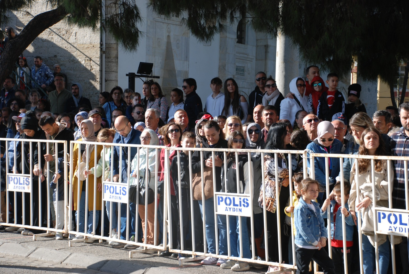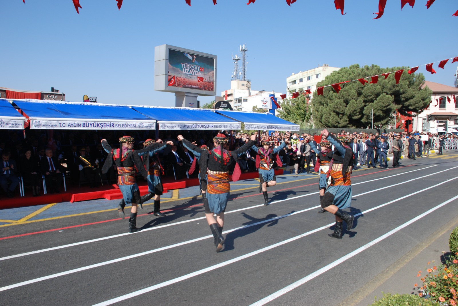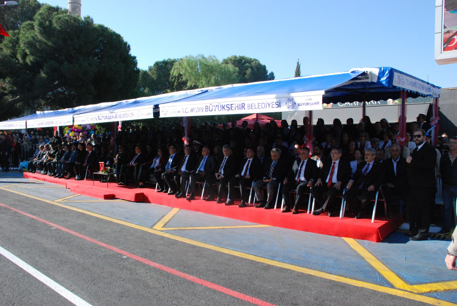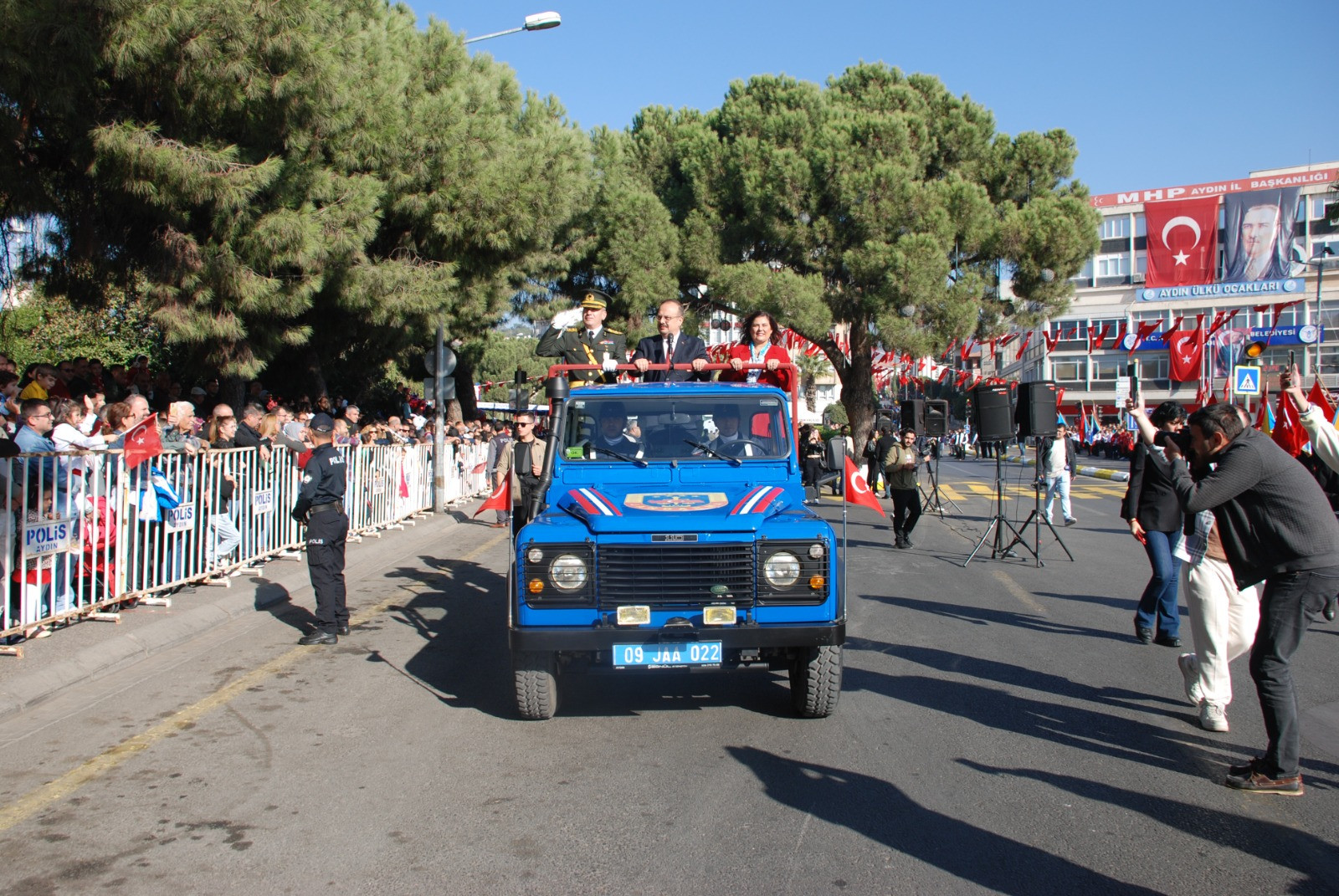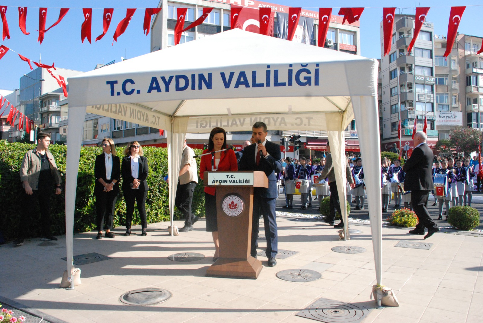 Aydın Valiliği’ndeki tebrikat töreninin ardından İstasyon Meydanı’nda Aydın Valisi Yakup Canbolat, Aydın Büyükşehir Belediye Başkanı Özlem Çerçioğlu ve Garnizon Komutanı Albay Mehmet Toker, tören aracı ile halkı ve törene katılanları selamlaması ile başlayan tören, saygı duruşu ve İstiklal Marşı’nın okunması ile devam etti.
