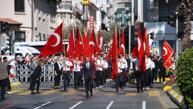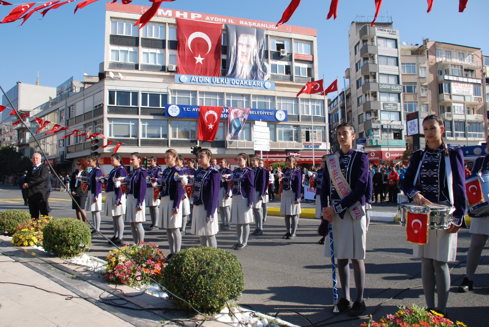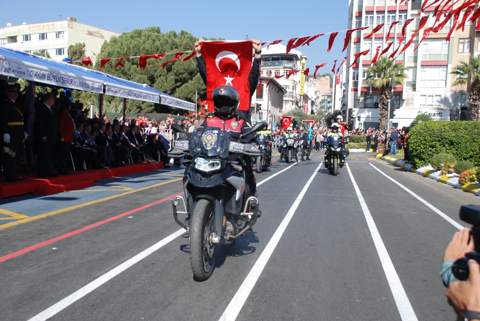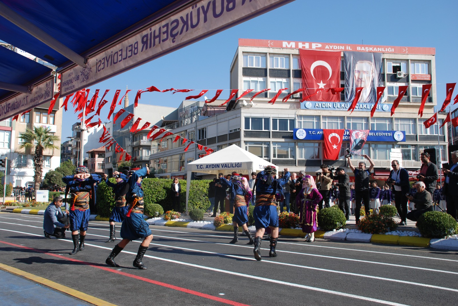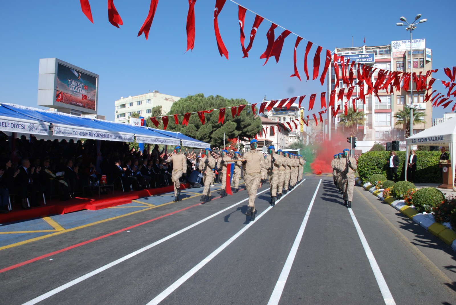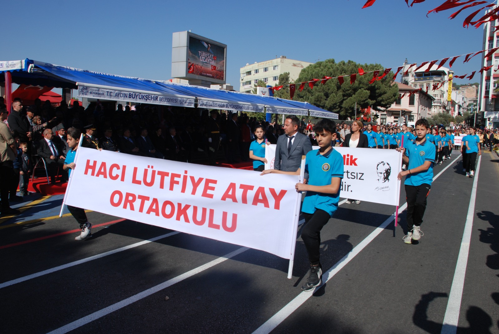 Aydın Valiliği’ndeki tebrikat töreninin ardından İstasyon Meydanı’nda Aydın Valisi Yakup Canbolat, Aydın Büyükşehir Belediye Başkanı Özlem Çerçioğlu ve Garnizon Komutanı Albay Mehmet Toker, tören aracı ile halkı ve törene katılanları selamlaması ile başlayan tören, saygı duruşu ve İstiklal Marşı’nın okunması ile devam etti.