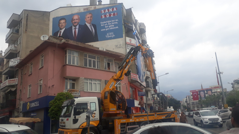 Aydın'da AK Parti İl Başkanlığının bulunduğu binanın yan cephesine CHP tarafından gece saatlerinde asılan afiş gerilime neden olurken, iki taraf da konuyu İl Seçim Kuruluna taşıdı. Mayıs ayının 14'ünde gerçekleştirilecek olan genel seçimlere 18 gün kala Aydın'da siyasi tansiyon yükselirken, kent meydanında bulunan ve aralarında AK Parti Aydın İl Başkanlığının da yer aldığı binanın yan cephesine CHP Aydın İl Başkanlığı tarafından gece saatlerinde afiş asıldı. Afişte Millet İttifakı Cumhurbaşkanı Adayı Kemal Kılıçdaroğlu, İstanbul Büyükşehir Belediye Başkanı Ekrem İmamoğlu ve Ankara Büyükşehir Belediye Başkanı Mansur Yavaş'ın fotoğrafları yer aldı. Siyasi slogan olarak "Kaybettiğin her an, her yıl, her kuruş, her gülüş sana geri dönecek" ifadelerine yer verilen afişi fark eden vatandaşlar duruma tepki gösterdi.