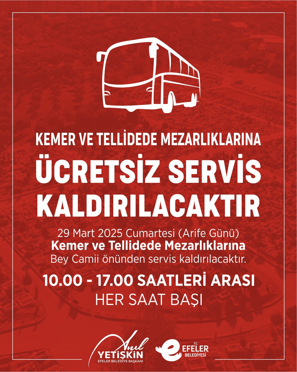 Efeler Belediye Başkanı Anıl Yetişkin Bayramda mezarlıklarını ziyaret etmek isteyen vatandaşlar için, Efeler Belediyesi ücretsiz servis hizmeti sunacak. Kemer ve Tellidede mezarlıklarına ulaşım sağlamak isteyenler için düzenlenecek bu servis hizmeti, 29 Mart Cumartesi günü arife günü ve Ramazan Bayramı’nın birinci günü geçerli olacak.