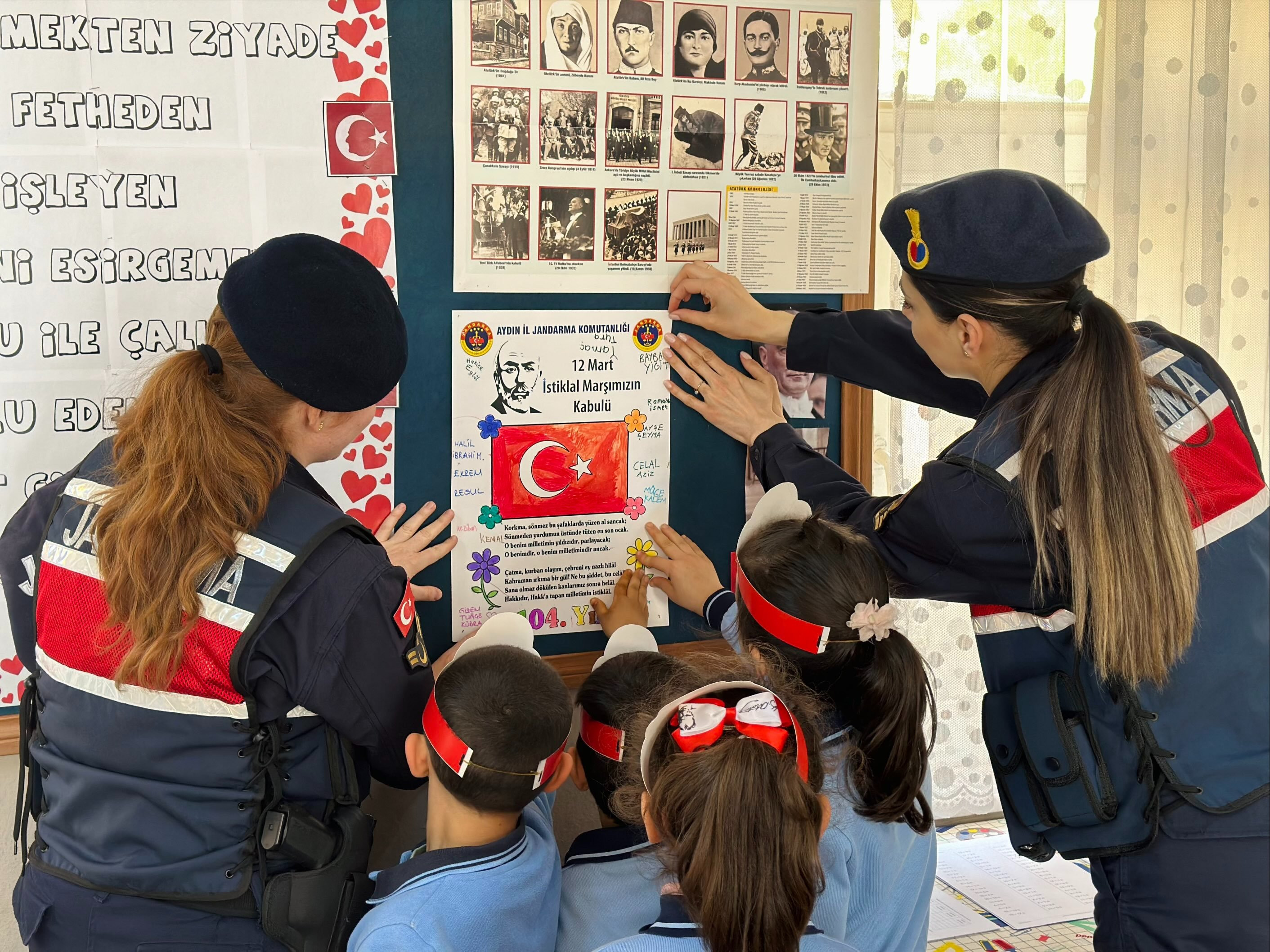 Aydın İl Jandarma Komutanlığı Aile İçi Şiddetle Mücadele ve Çocuk Kısım Amirliği ile Efeler İlçe Jandarma Komutanlığı personeli, İstiklal Marşı’nın kabulünün 104. yılı dolayısıyla Efeler Dağeymiri İlkokulu’nda öğrencilere özel bir etkinlik düzenledi.