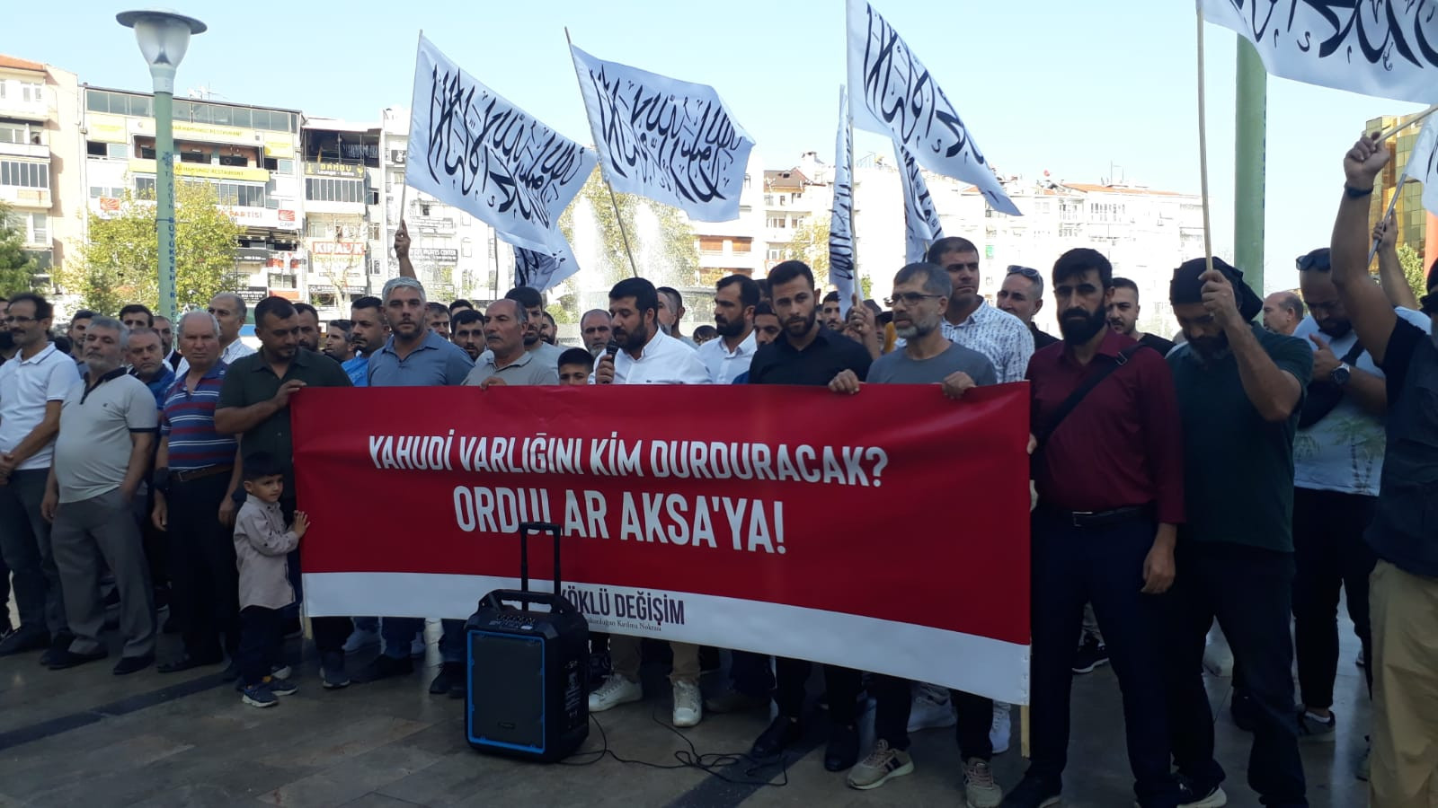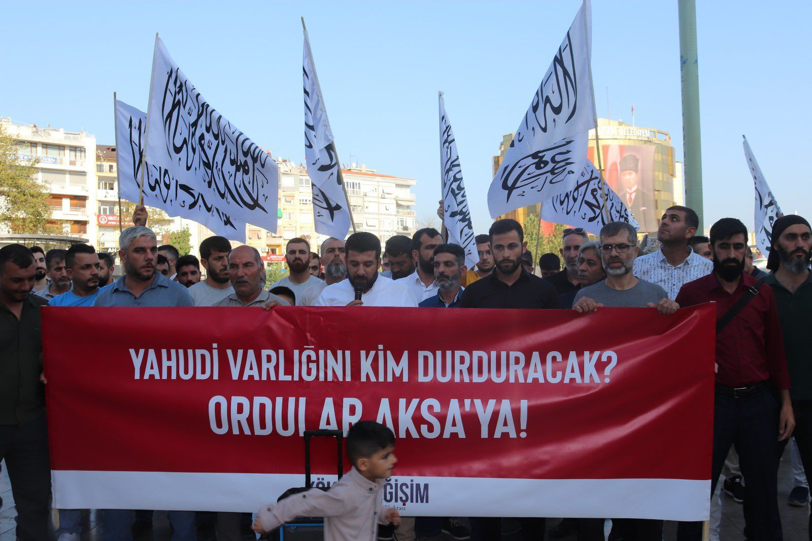 Aydın'da Köklü Değişim Hareketi, "Aksa Tufanı Operasyonu"na destek vermek amacıyla büyük bir basın açıklaması düzenledi. Kalabalık bir topluluğun katıldığı etkinlikte "Ordular Aksa'ya!" sloganları yükseldi.