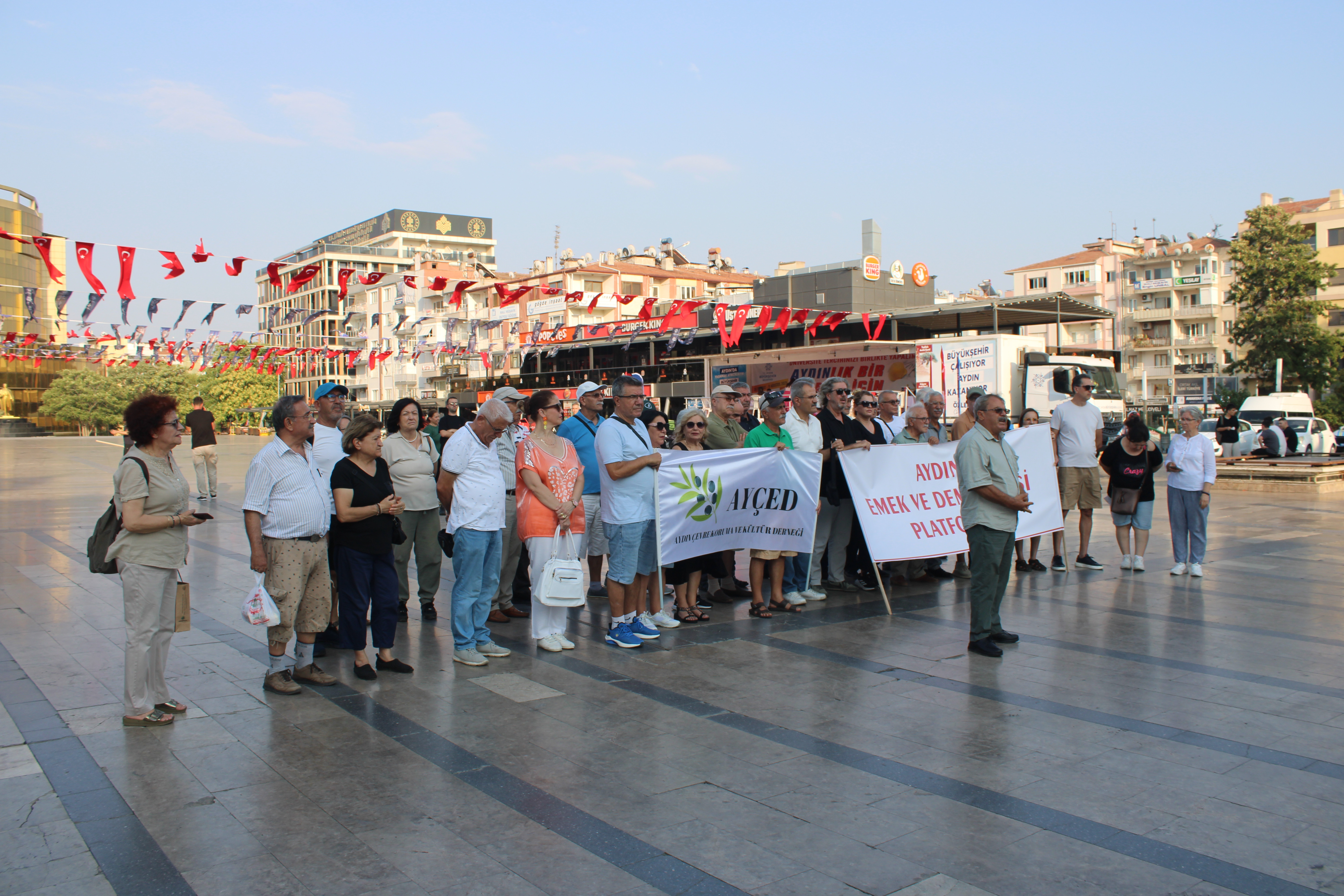 Aydın Emek ve Demokrasi Platformu ile AYÇED üyeleri, artan orman yangınlarına dikkat çekmek için Atatürk Kent Meydanı’nda bir araya geldi.