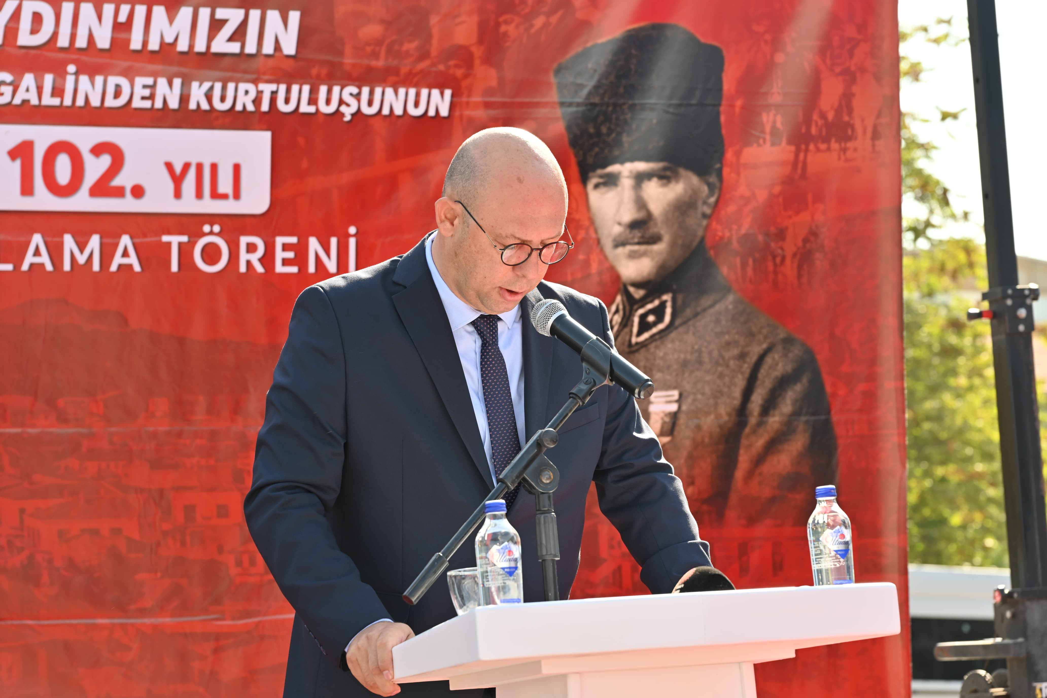 Saygı duruşu ve İstiklal Marşı’nın okunmasının ardından günün anlam ve önemine ilişkin konuşma yapan Başkan Vekili Mersin; “İçlerindeki özgürlük ateşiyle kanını bu topraklar için feda eden Yörük Ali Efe, Demirci Mehmet Efe, Albay Şefik, Çete Ayşe gibi ölümsüz kahramanlarımızın gururlu ve başı dik torunlarıyız. 2 defa işgal edilip 2 defa milli kurtuluş mücadelesi veren ve özgürlüğünü düşmandan söküp alan tek şehirdir Aydın. Atalarımızla gurur duyuyor ve onları minnetle anıyoruz. Bizler bu şanlı destanın mirasçıları olarak bağımsızlığımızdan hiç bir zaman taviz vermedik ve asla taviz vermeyeceğiz. Başta Ulu Önder Gazi Mustafa Kemal Atatürk ve silah arkadaşları olmak üzere bağımsızlık uğruna canını feda etmiş tüm kahraman şehitlerimizi ve gazilerimizi minnetle anıyorum. Ruhları şad olsun. Efeler diyarı Aydın’ımızın kurtuluşunun 102. yılı kutlu olsun” dedi.