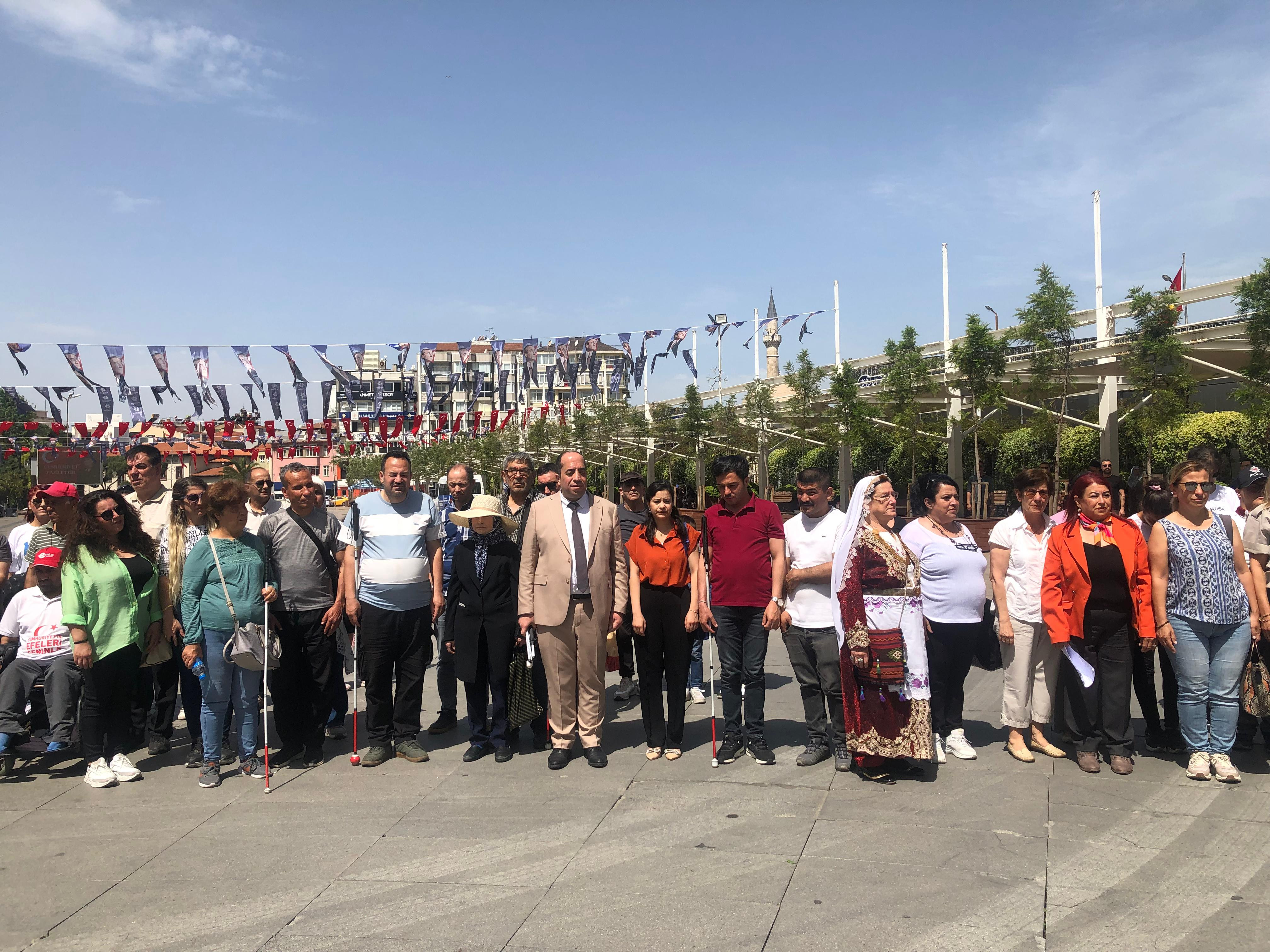 Altı Nokta Körler Derneği Aydın Şubesi tarafından Engelliler Haftası dolayısıyla düzenlenen törende engelli bireyler Atatürk Kent Meydanı'nda bir araya gelerek çelenk bıraktı.