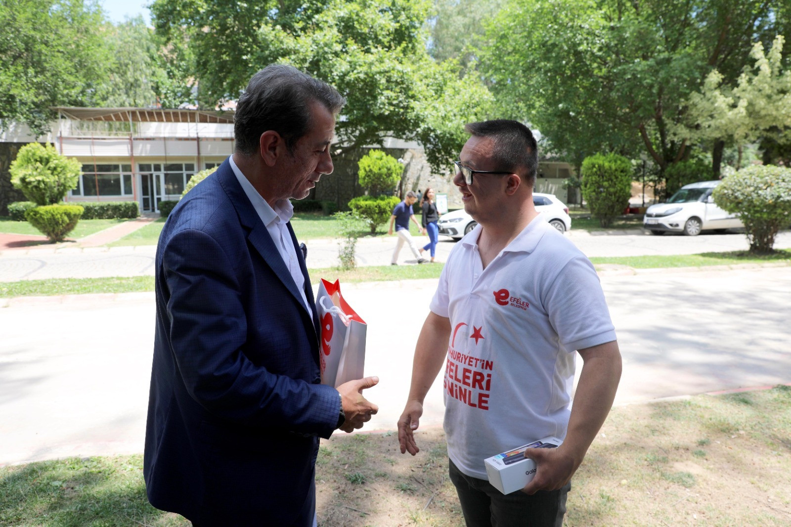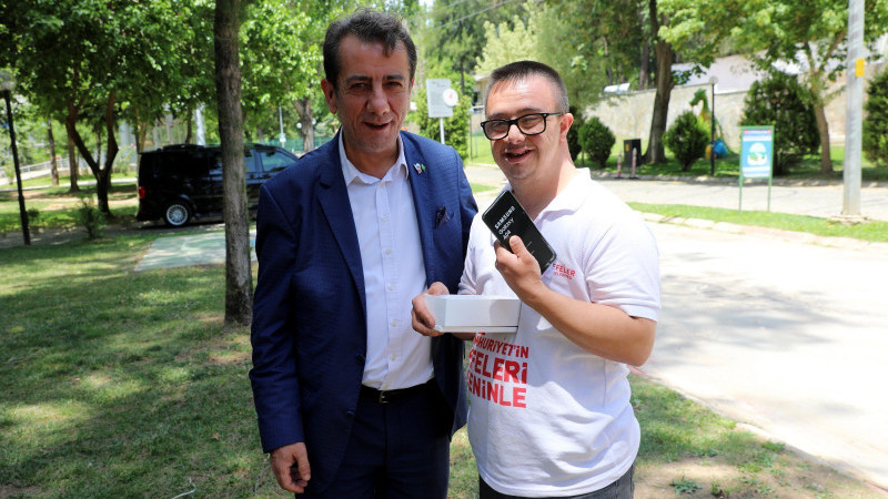 Efeler Belediye Başkanı Anıl Yetişkin, Down Kafe’de çalışan Ozan Çobanoğlu’nun akıllı telefon isteğini geri çevirmeyerek ona büyük bir mutluluk yaşattı.