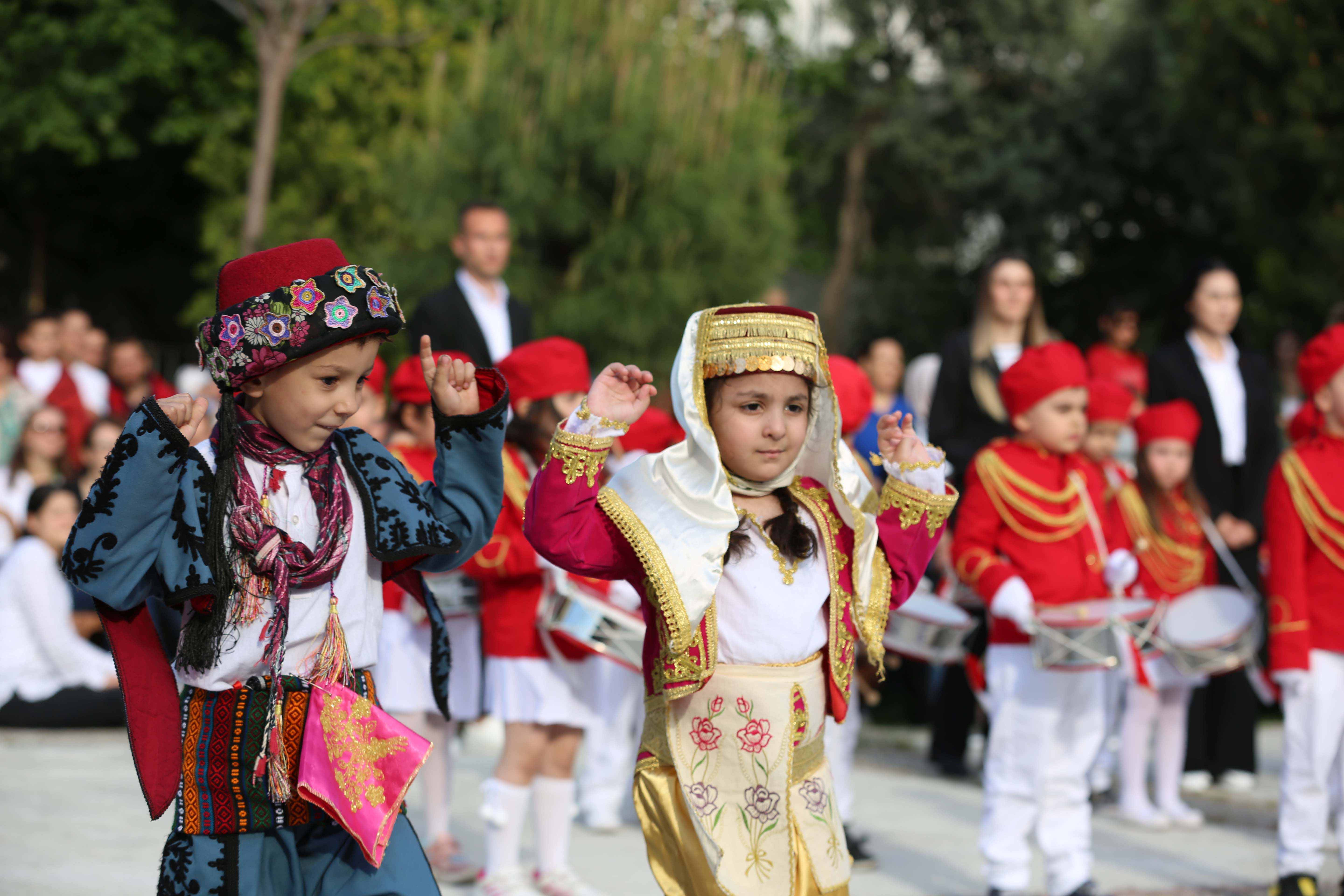 Rengârenk kıyafetler giyen ve ay yıldızlı bayrakları ellerine alarak