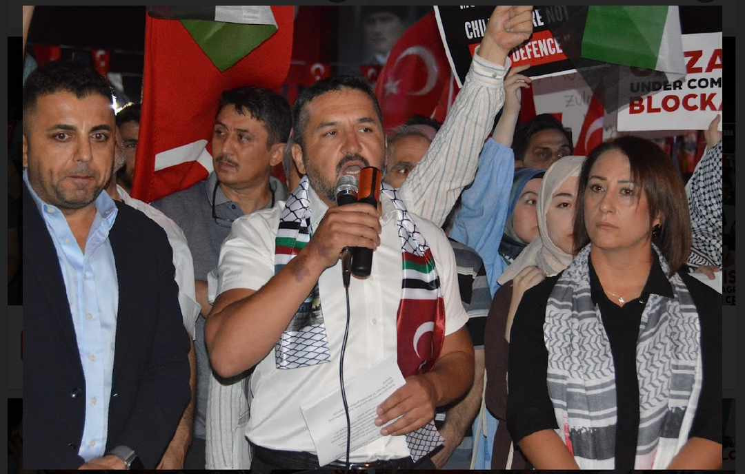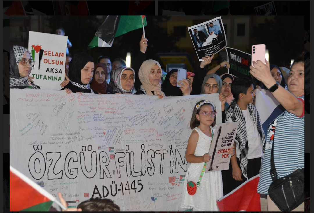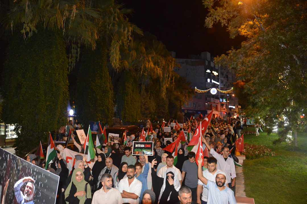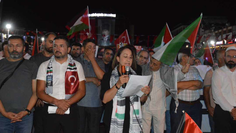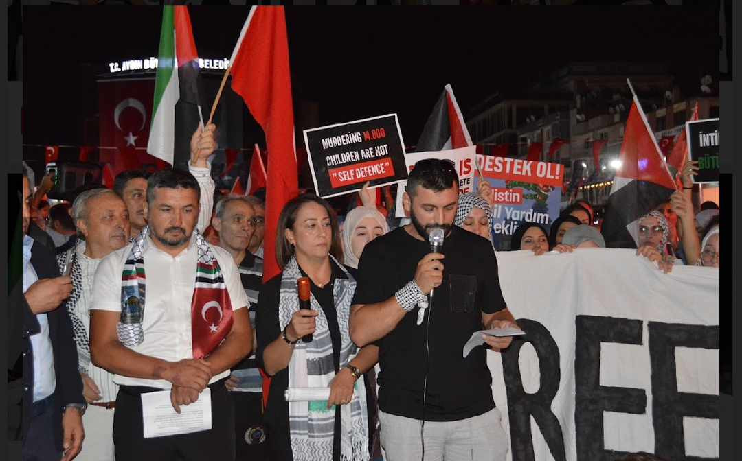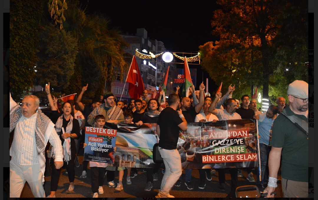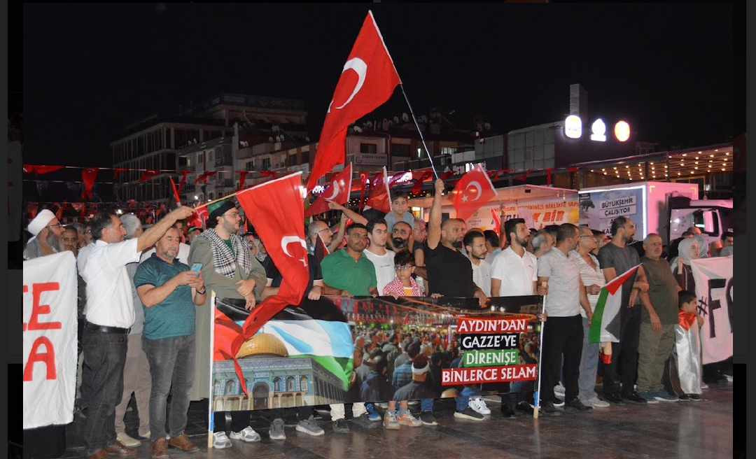 Vatandaşlar "Katil İsrail Filistin'den defol", "Hamas'a selam, direnişe devam", sloganları ile İsrail'e tepki gösterdi. Hak iş Aydın il başkanı Nefise Gülseren, Kuran-ı Kerim tilavetinin ardından konuşma yapan Memur-Sen Aydın İl Başkanı Fatih Taşpınar, ilk kıblegahı Mescidi Aksa, onur, gelecek ve insanlık için toplanıldığını vurguladı. Taşpınar, şöyle devam etti: "Neredeyse yüz yıldır vahşetin her türlüsünü Filistinlilere reva gören Siyonistler dünyayı Yahudi soykırımı acındırmasıyla acındırdı. Her Türlü zulmün üstünü her seferinde bunlarla örttü. Kanlı ellerini Müslüman kanıyla temizlemeye kalktı. Milyonlarca insan, kendi öz topraklarında sürgün, kendi topraklarında açık hapishaneye mahkum, kendi topraklarında katledileceği günü bekliyor. Biz sustukça onların sesi daha gür çıkacak, biz kabullendikçe onlar daha çok tepinecek, biz görmezden geldikçe onlar daha çok katledecek" dedi.