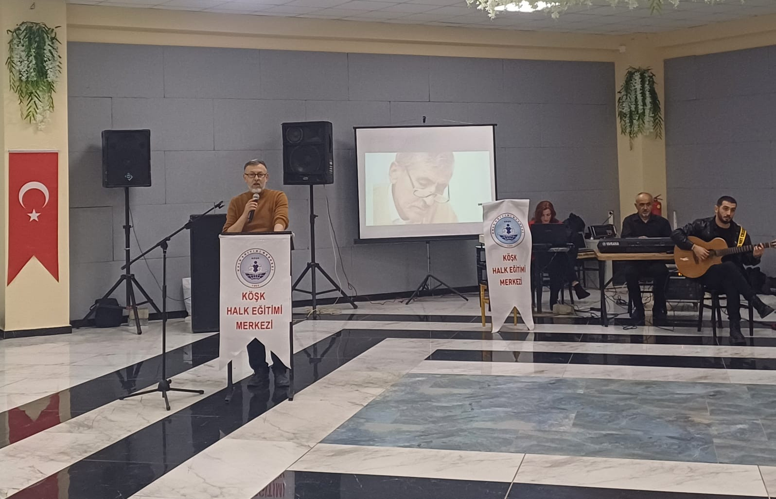 Program sunuculuk görevini üstlenen İlyas Doğan; ‘Abdurrahim KARAKOÇ, 7 nisan 1932 yılında Kahramanmaraş’ın elbistan ilçesinin cela köyünde bugünkü adıyla ekin özünde doğdmuş ve 7 Haizran 2012’de vefat etmiştir. Mihriban, Hasana Mektuplar, Eli Kulakta, VurEmri, Kanyazısı, SularıIslatamadım,BeşinciMevsim, DostaDoğru, Gerdanlık 1-2-3 ve Anadoluda Bahar olmak üzere 12 adet şiir kitabı bulunmaktadı. 200’ün üzerinde şiiride günümüze kadar bestlenmiştir. KARAKOÇ, yaşantısıyla ve sanatıyla insanımıza örnek olmuş önemli bir şahsiyettir. Onu anlamak için Anadolu yaşantısı kokan şiirlerini okumalı ve anlamalıdır. Her öğrencimizin şairin şiirlerinden birkaçını ezbere bilmesini hayat tarzını benimsemesini istiyorum. Bu gece sizlere üstadın bestelenen şiirlerinden türkü tadında bir gece geçirmeniz için hazırladığımız programa hepiniz hoş geldiniz.’ Doğan, Abdurrahim Karakoç'tan bazı dizeleri okuyarak hayatıyla ilgili bazı konulara değindi.