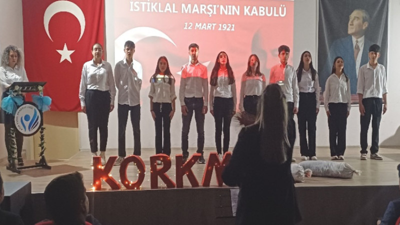 Çerçevik; "Dalgalandığın yerde ne korkun ne keder gözgende bana da bana da yer ver. Sabah olmasın günler doğmasın ne çıkar, yurda ay yıldızının ışığı yeter. Savaş bize karda dağlara götürdüğü gün kızıldığında ısındık dağlardan çöllere düşürdüğü gün gölgenin sığındık. 11-A sınıfından öğrencimiz Nurettin Özcan İstiklal Marşı'nı dinlerken adlı şiiri okuyacaktır" dedi.