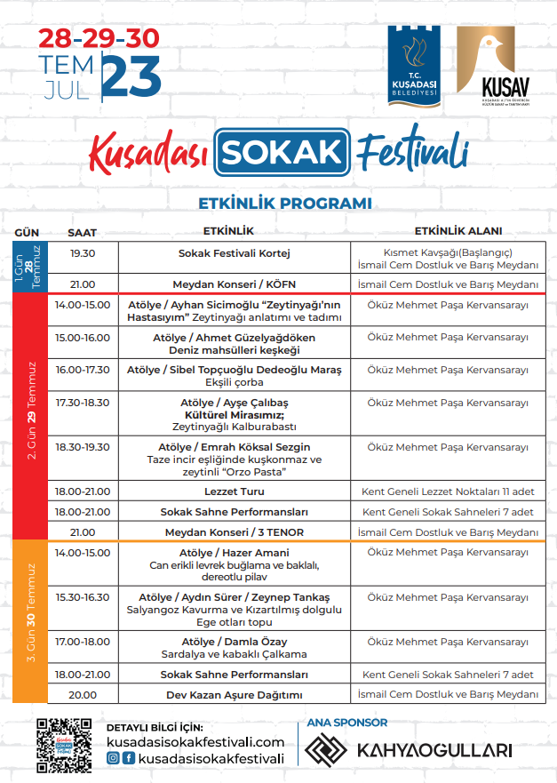 Kuşadası, Türkiye'nin turizm başkenti olarak bilinen ve her yıl milyonlarca yerli ve yabancı turisti ağırlayan bir kent. Bu yıl ikinci kez düzenlenecek olan Kuşadası Sokak Festivali ise kente ayrı bir coşku ve renk katacak. Kuşadası Belediyesi ile Kuşadası Altın Güvercin Kültür Sanat ve Tanıtım Vakfı (KUSAV) iş birliğinde, Ayhan Sicimoğlu'nun danışmanlığında gerçekleştirilecek olan festival, 28-30 Temmuz tarihleri arasında sokaklarda gastronomi, müzik, sanat ve eğlenceyi buluşturacak.