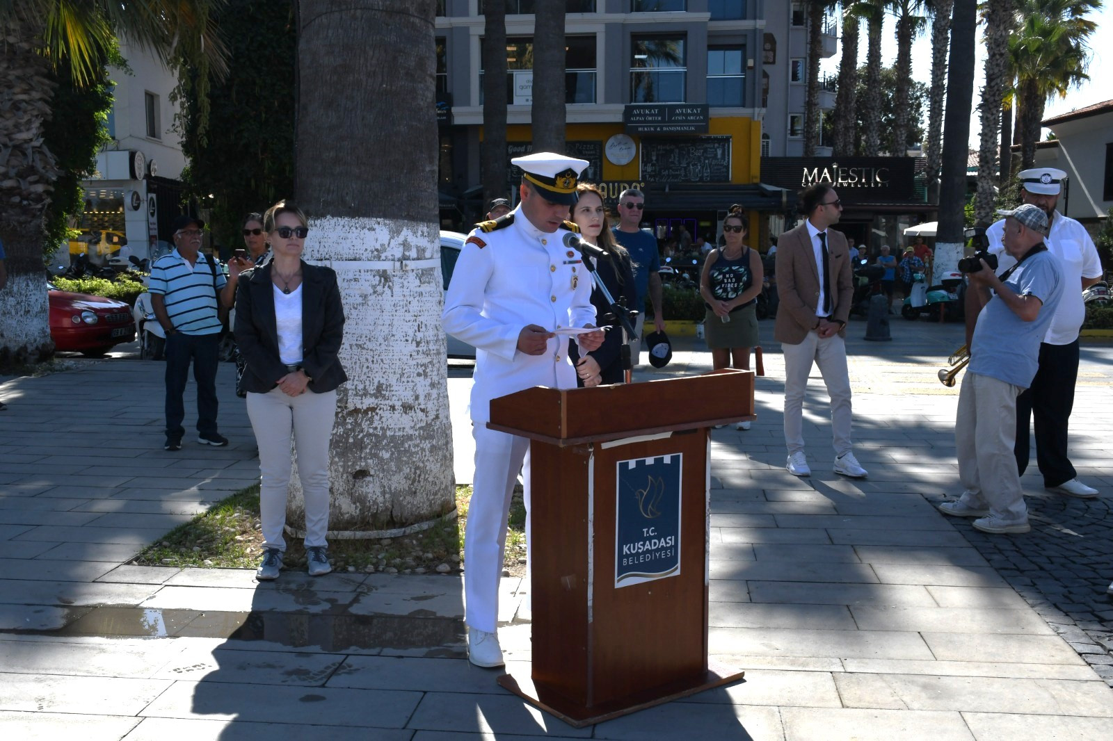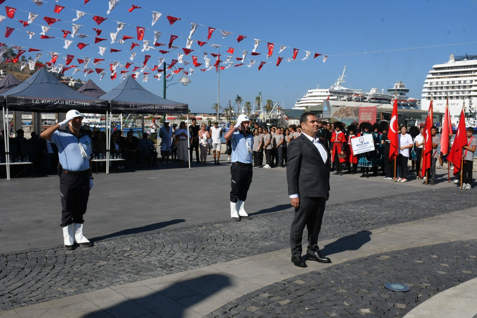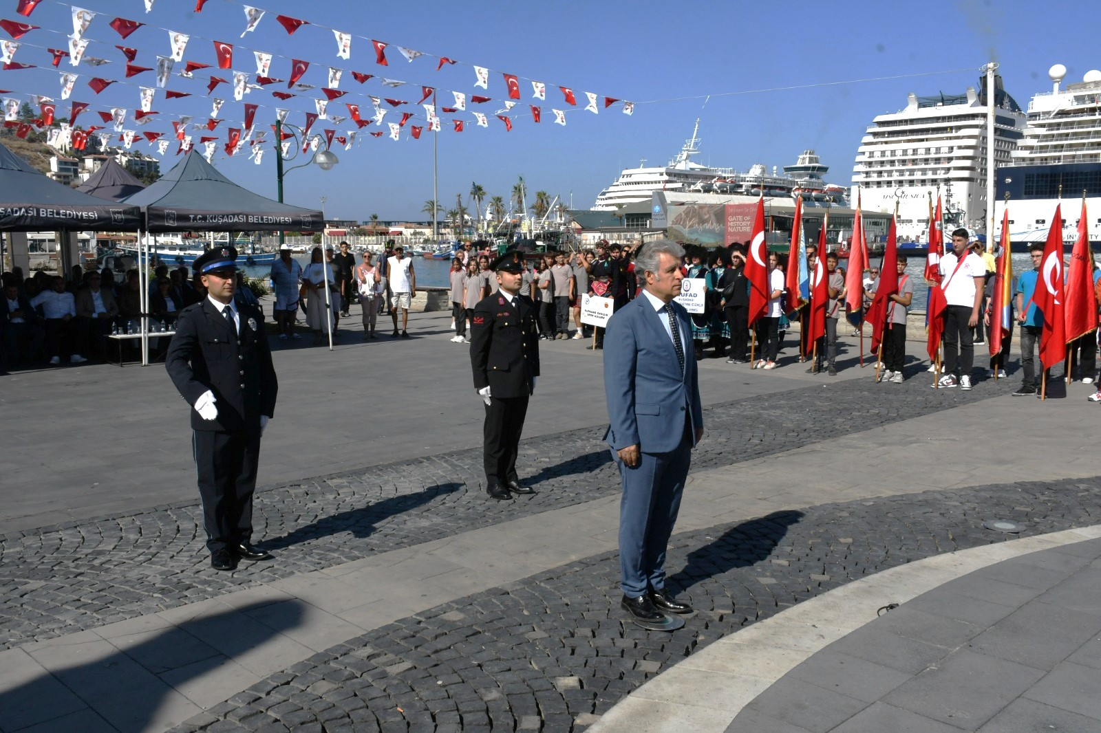 Tören, Kuşadası Kaymakamı İbrahim Keklik ve Belediye Başkan Vekili Metin Uğur'un Atatürk Anıtı'na çelenk sunmasıyla başladı. Ardından, Türk milletinin bağımsızlık ve vatan sevgisini simgeleyen İstiklal Marşı'nın gururla okunmasıyla devam etti. Sahil Güvenlik Karakol Komutan Vekili Üsteğmen Emre Kaçak, açılış konuşmasında şunları söyledi: "19 Eylül Gaziler Günü, bu toprakları vatanlaştıran atalarımızın emanetine sahip çıkmak için 'ölürsek şehit, kalırsak gazi oluruz' düşüncesiyle her türlü düşmana karşı kahramanca mücadele veren Türk askeri ve taşıdığı bu yüce ruh var olduğu müddetçe bölünmez bütünlüğümüze ve milli birliğimize kast edenlerin kirli emelleri asla gerçekleşmeyecektir."