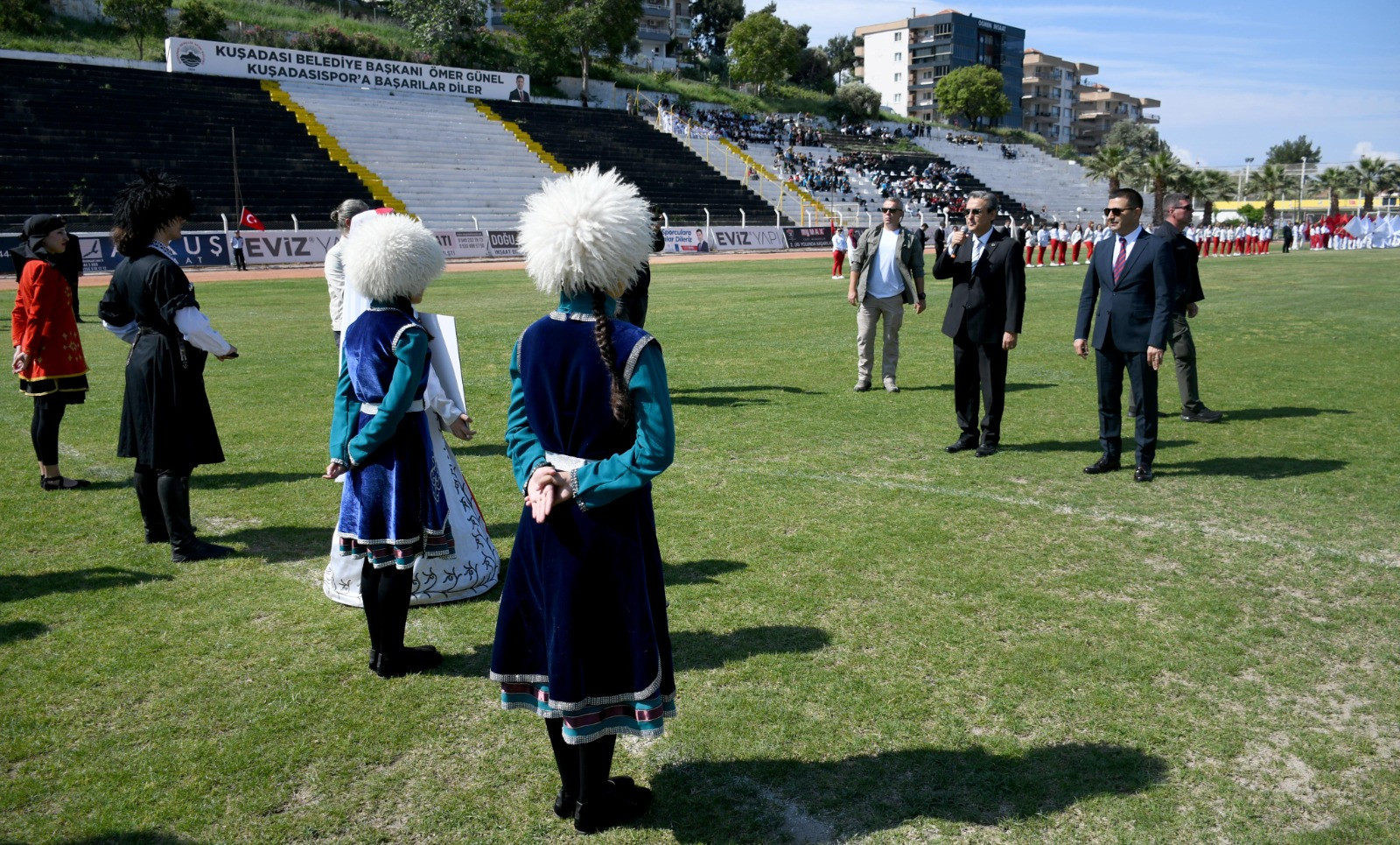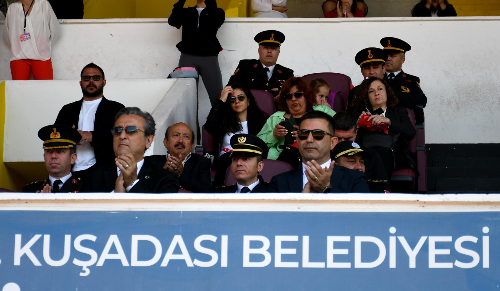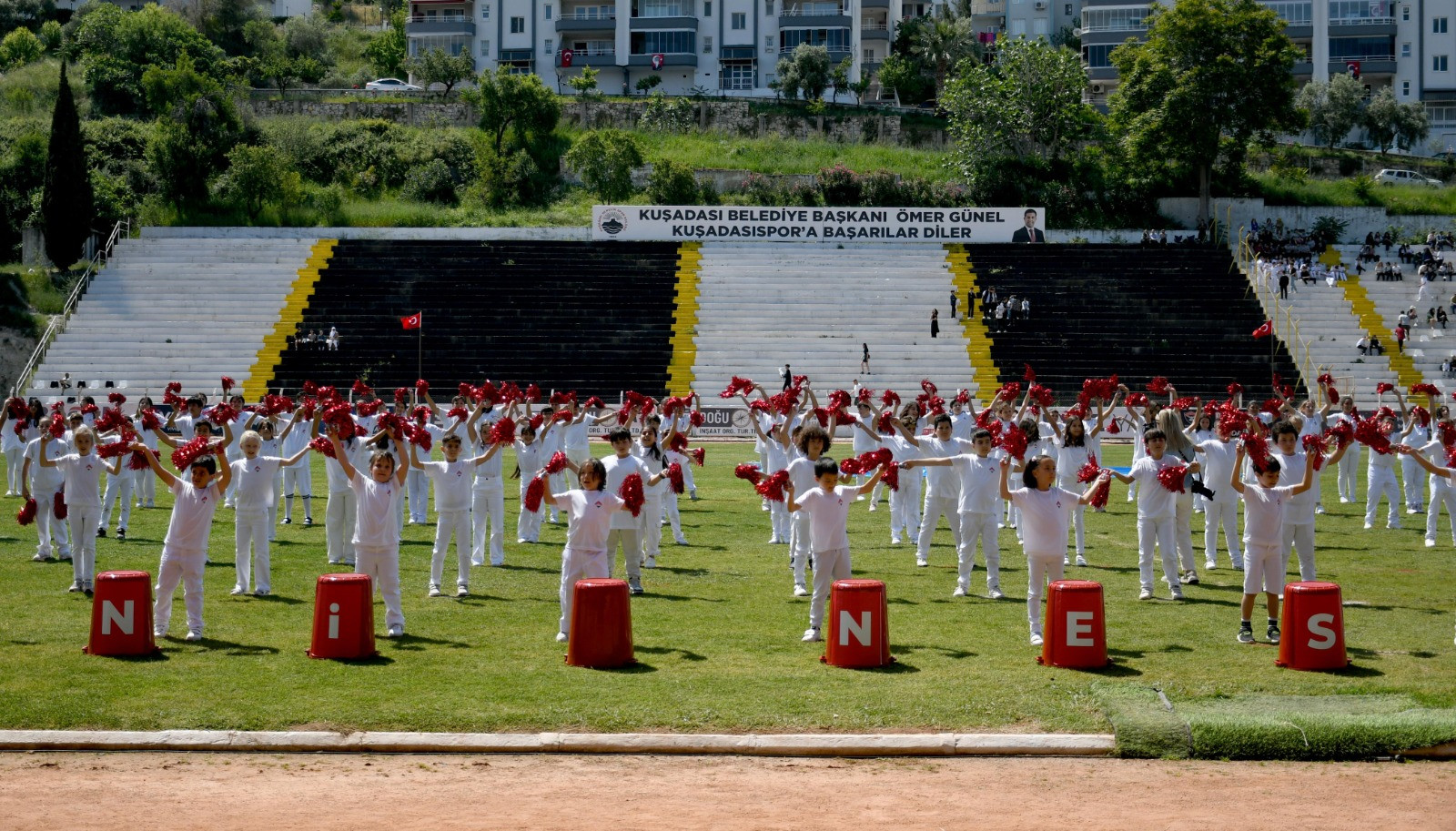Özer Türk Stadı’ndaki programda, saygı duruşunda bulunulması ve İstiklal Marşı'nın okunmasının ardından Kuşadası Kaymakamı Sadettin Yücel ve Belediye Başkanı Ömer Günel, törene katılan öğrenciler ile vatandaşların bayramını kutladı. Günün anlam ve önemini belirten konuşmaların ardından dans ve jimnastik gösterileri sergilendi. Daha sonra Kuşadası Kaymakamı Sadettin Yücel, Belediye Başkanı Ömer Günel ve İlçe Milli Eğitim Müdürü İbrahim Ataman tarafından uluslararası turnuvalarda dereceye giren sporculara çeşitli hediyeler verildi. Kutlama programında lise öğrencileri tarafından okunan “Atatürk’ün Gençliğe Hitabesi ve Gençliğin Ata’ya Cevabı” Kuşadalılar tarafından ayakta alkışlandı.