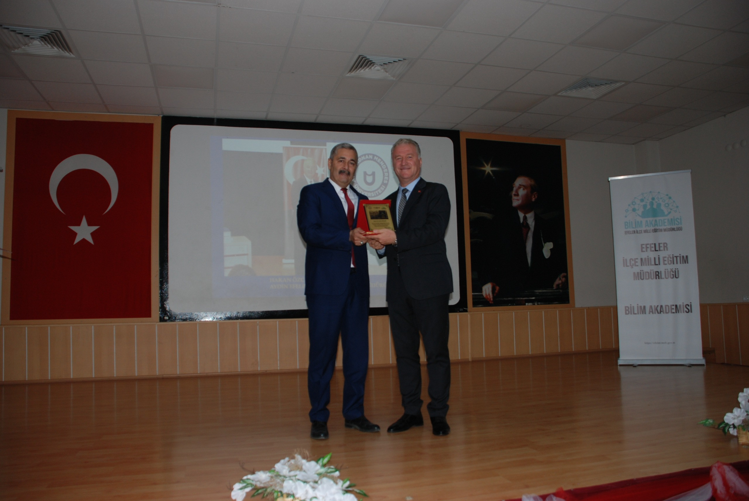 Aydın Sosyal Bilimler Lisesi'nde, Efeler İlçe Milli Eğitim Müdürlüğü Bilim Akademisi tarafından düzenlenen öğrencilerine yönelik “Yörük Ali Efe ve Malgaç Baskını” konferansı düzenlendi. Hakan Özcan, konuşmacı Dr. Fatih Özkurt’a plaket takdim etti.