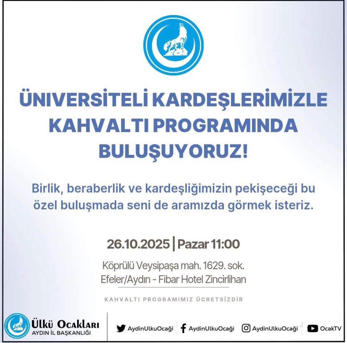 Ülkü Ocakları Aydın İl Başkanı Okan Bozkurt, Adnan Menderes Üniversitesi öğrencileriyle düzenlenen kahvaltı programında bir araya gelerek birlik, beraberlik ve kardeşlik mesajı verdi.