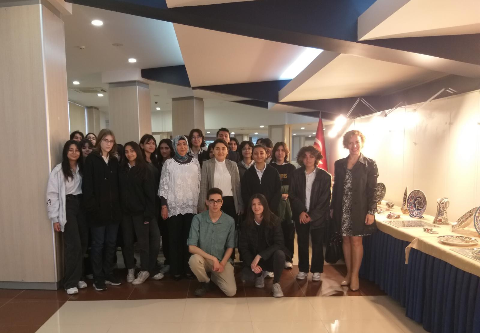 Serginin ilk gününde Aydın Güzel Sanatlar Lisesi Resim Bölümü Başkanı Emine Fida Rüzgar ve öğrencileri sergiyi gezerek eserleri inceledi.