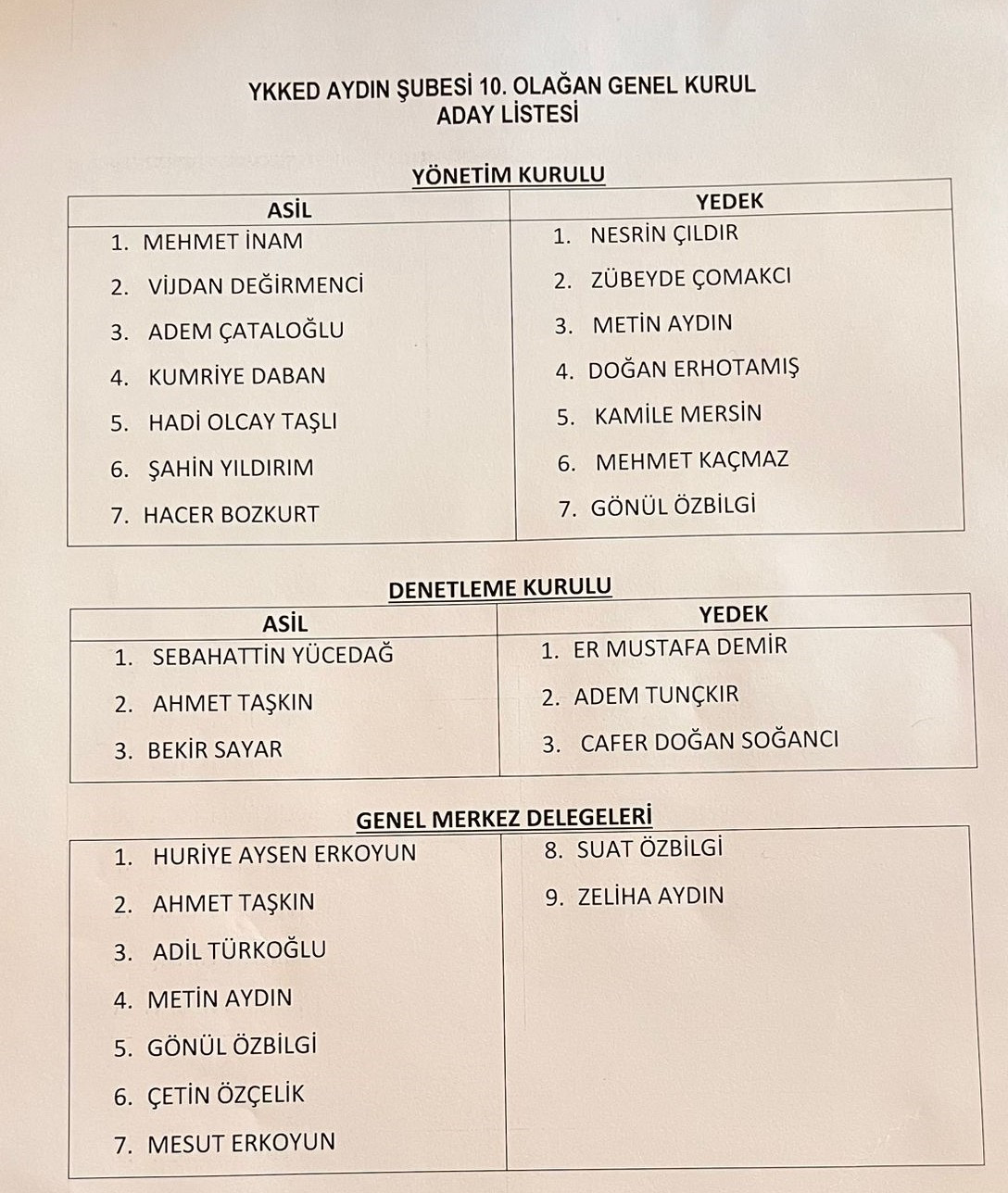 YKKED Aydın Şubesi Yönetim Kurulu Aday Listesi ise şu şekilde belirlendi: