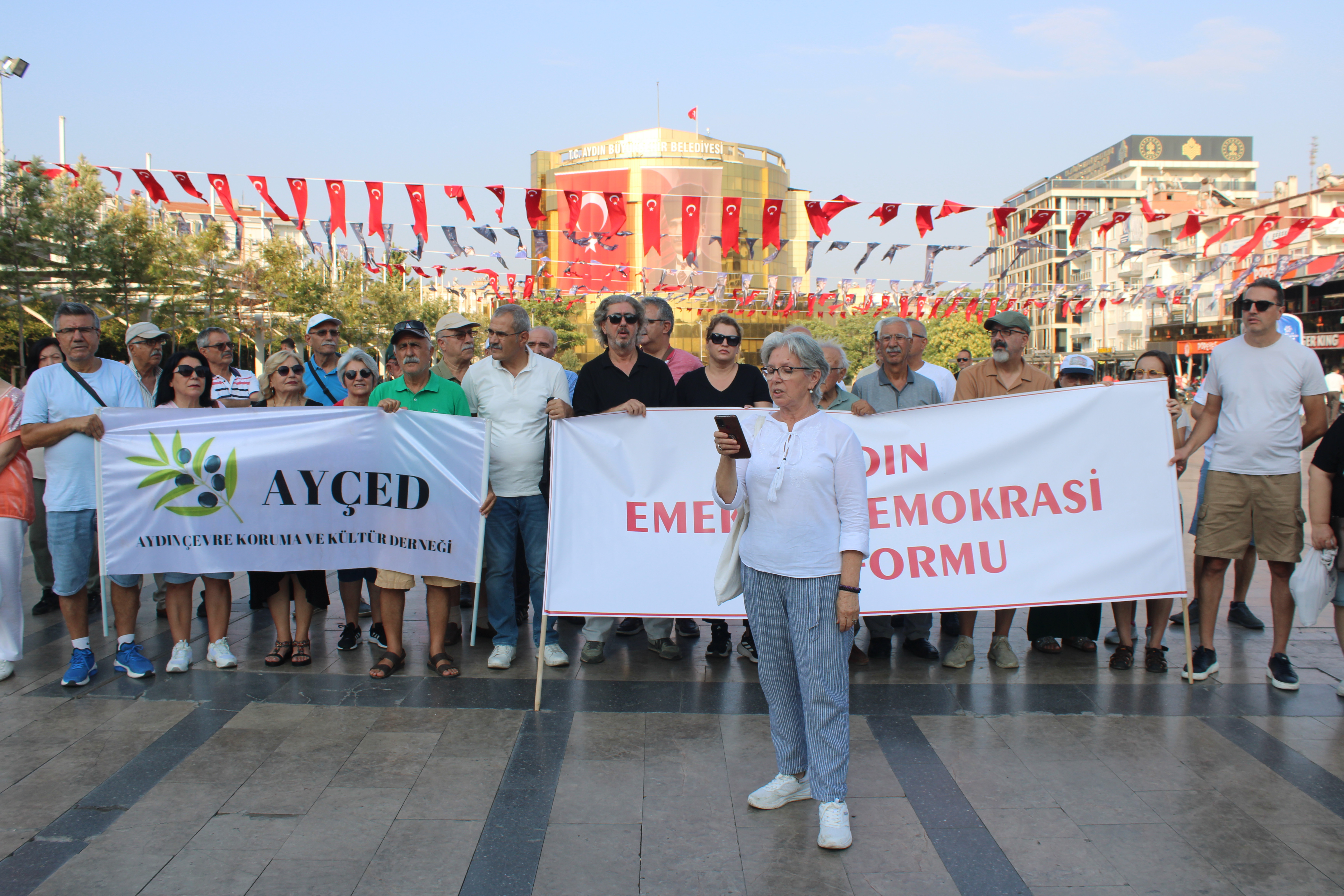 Aydın Emek ve Demokrasi Platformu ile AYÇED üyeleri, artan orman yangınlarına dikkat çekmek için Atatürk Kent Meydanı’nda bir araya geldi.