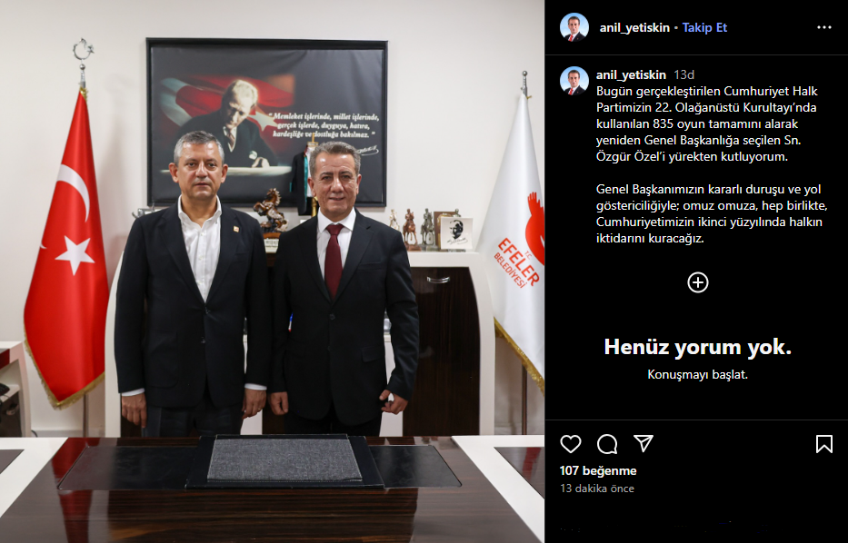 Efeler Belediye Başkanı Anıl Yetişkin, CHP’nin 22. Olağanüstü Kurultayı’nda yeniden Genel Başkan seçilen Özgür Özel’i sosyal medyadan kutladı.