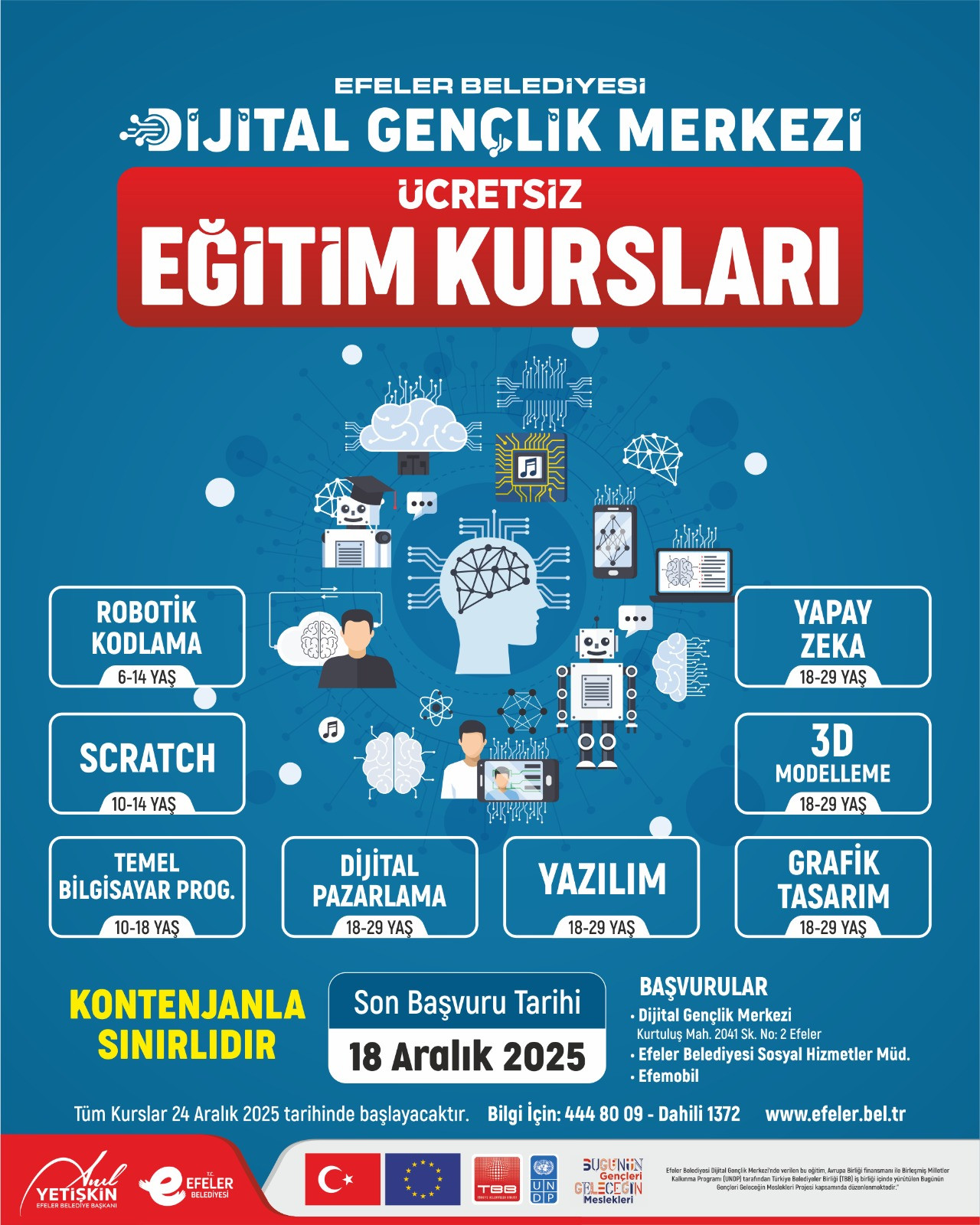 Efeler Belediyesi’nin hayata geçirdiği Dijital Gençlik Merkezi eğitim kursları için başvurular başladı. Robotik kodlamadan yapay zekâya kadar geniş kapsamlı eğitimler 6-29 yaş grubuna ücretsiz verilecek.