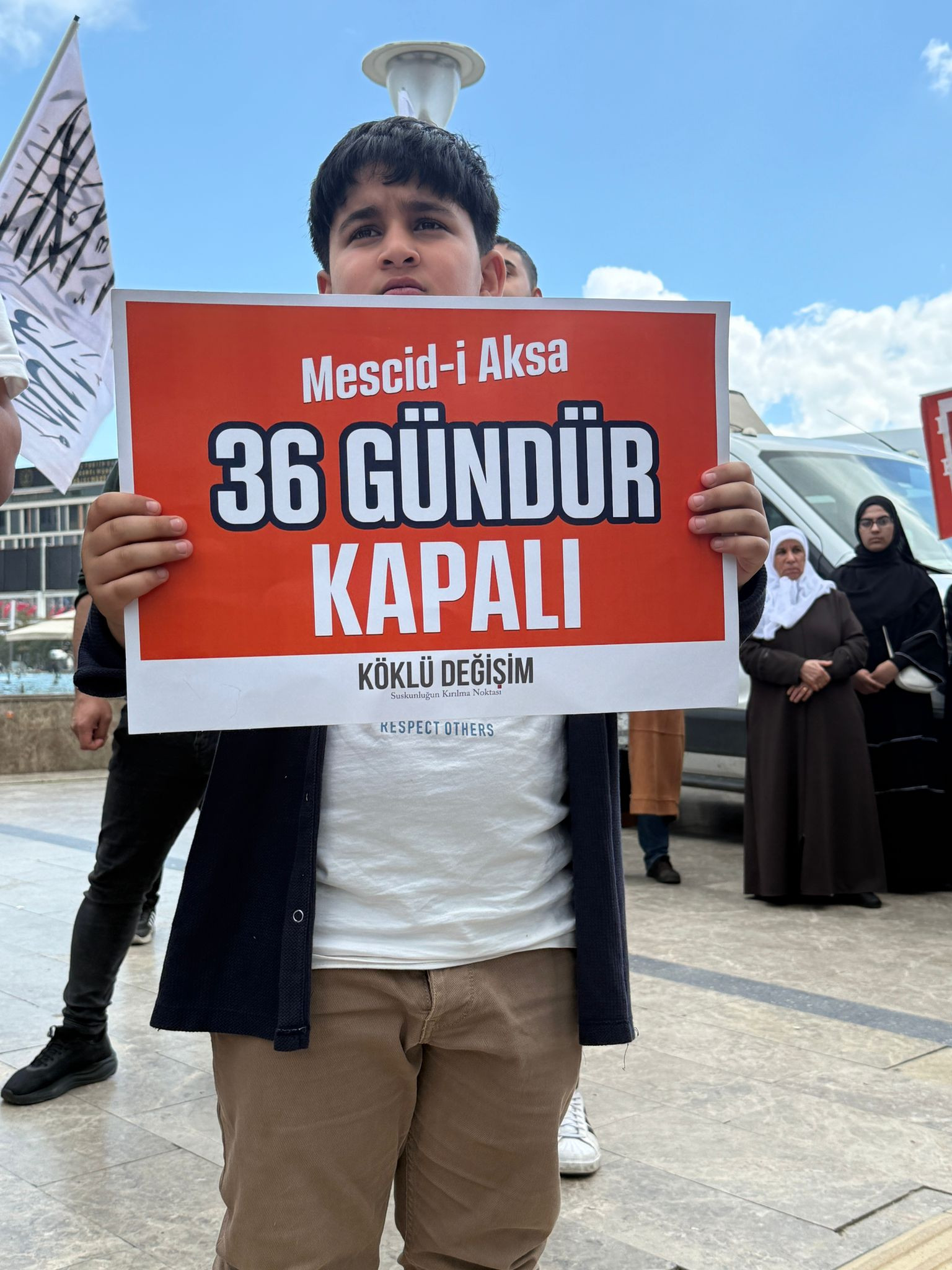 Köklü Değişim üyeleri, Aydın Kent Meydanı’nda düzenlenen basın açıklamasında Mescid-i Aksa’daki işgale ve Filistin’e yönelik saldırılara tepki gösterdi.