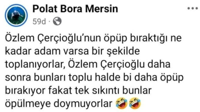 Paylaşımında, "Özlem Çerçioğlu' nun öpüp bıraktığı ne kadar adam varsa bir şekilde toplanıyorlar. Özlem Çerçioğlu daha sonra bunları toplu halde bir daha öpüp bırakıyor. Fakat tek sıkıntı bunlar öpülmeye doymuyorlar" ifadelerini kullandı.