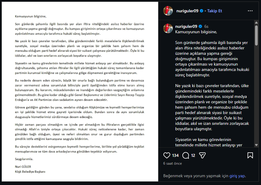 2019 yılından bu yana Köşk Belediye Başkanlığı görevini sürdüren Nuri Güler Kamuoyunda geniş yankı uyandıran söz konusu iddiaların ardından kamuoyunda ‘istifa edecek mi?’ soruları gündeme gelmişti.