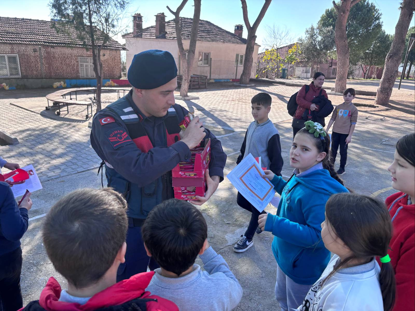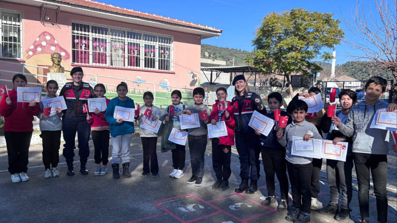 Aydın İl Jandarma Komutanlığı, Eskihisar İlköğretim Okulu'ndaki karne dağıtımında öğrencilerin sevincine ortak oldu.
