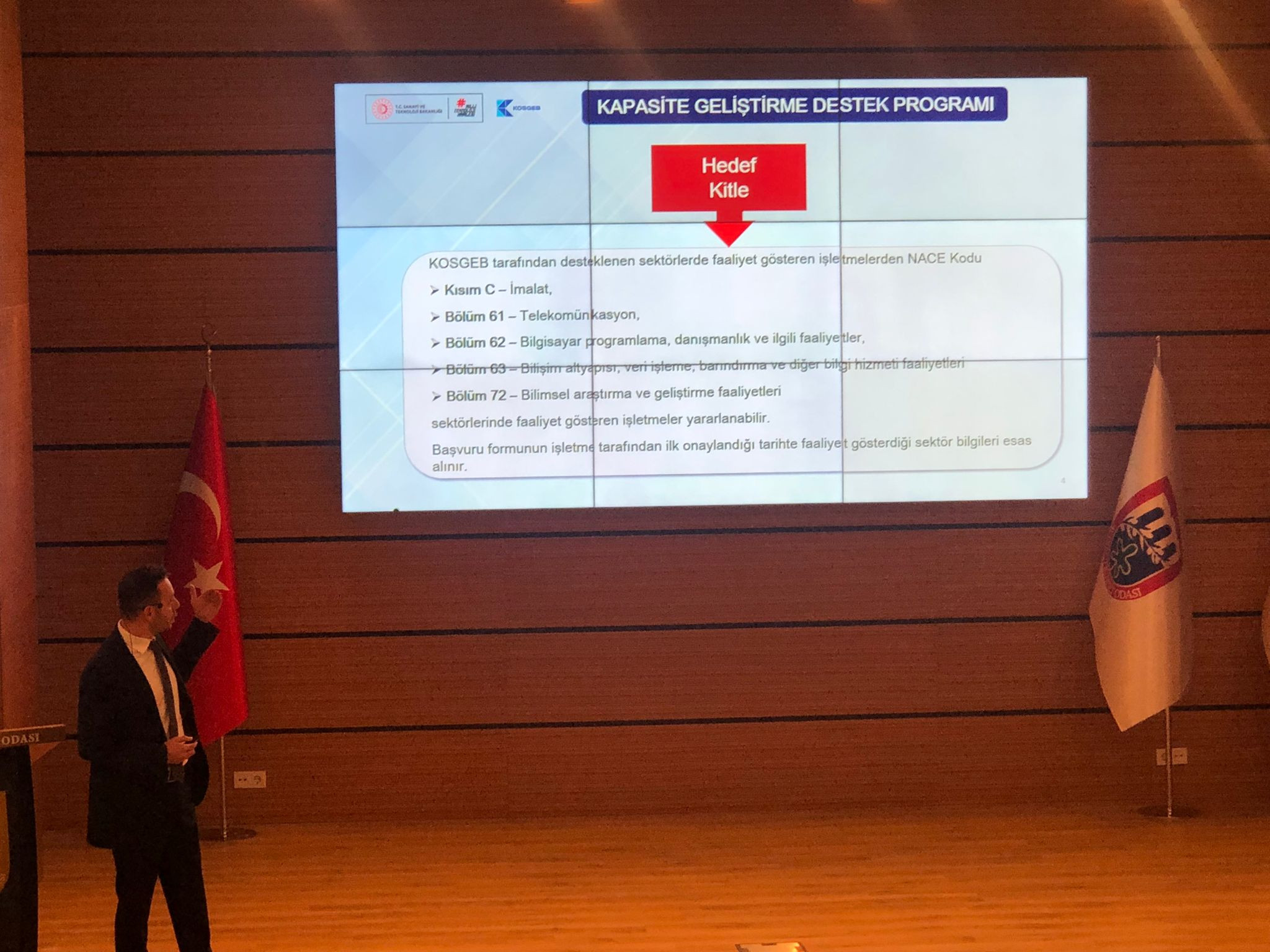 Sunumu gerçekleştiren Berkay Çetin Oral, destek programının mikro işletmeleri kapsamadığını, yalnızca küçük ve orta ölçekli işletmelere yönelik hazırlandığını ifade etti. Programa başvuracak firmaların limited veya anonim şirket statüsünde olması ve Sanayi Sicil Belgesi’ne sahip bulunması gerektiği belirtildi.