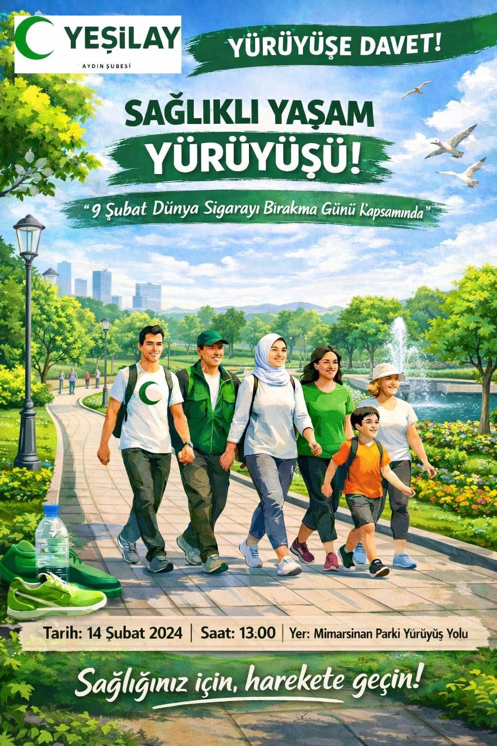 Toplumda sağlıklı yaşam bilincini artırmak ve sigaranın zararlarına dikkat çekmek amacıyla Yeşilay Aydın Şubesi tarafından “Sağlıklı Yaşam Yürüyüşü” düzenleniyor. Etkinlik, 14 Şubat 2024 Çarşamba günü saat 13.00’te, Aydın Efeler'de bulunan Mimarsinan Parkı Yürüyüş Yolu’nda gerçekleştirilecek.