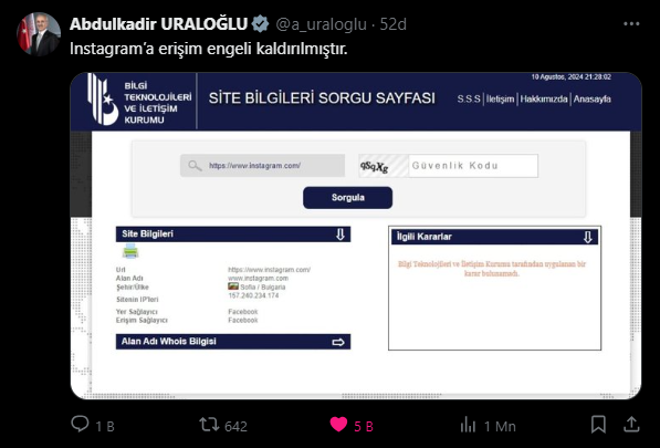 Ulaştırma ve Altyapı Bakanı Abdulkadir Uraloğlu, 10 Ağustos 2024 tarihinde sosyal medya hesabı üzerinden önemli bir açıklamada bulundu. Türkiye'de Instagram'a getirilen erişim engeli, saat 21.30 itibariyle kaldırıldı. Bakan Uraloğlu, bu kararın Instagram yetkilileri ile yürütülen müzakerelerin ardından alındığını ifade etti.